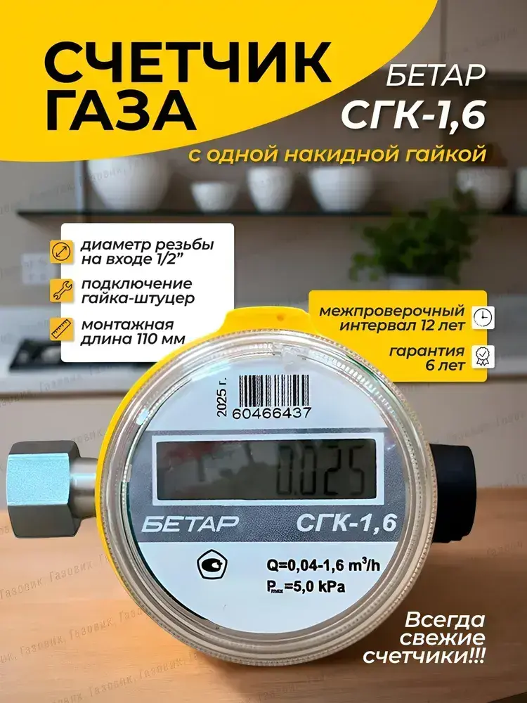 Счетчик газа Бетар СГК-1.6 с одной накидной гайкой, 2025 год
