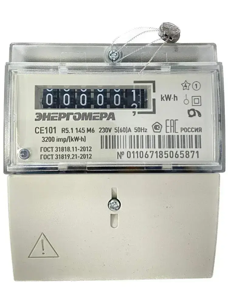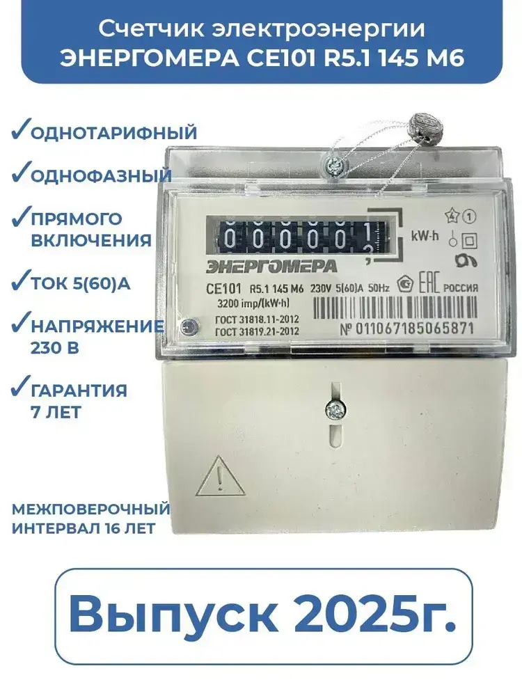Счетчик однотарифный однофазный Энергомера CE101 R5.1 145 M6 220В выпуск 2025г. 5-60А универсальное крепление