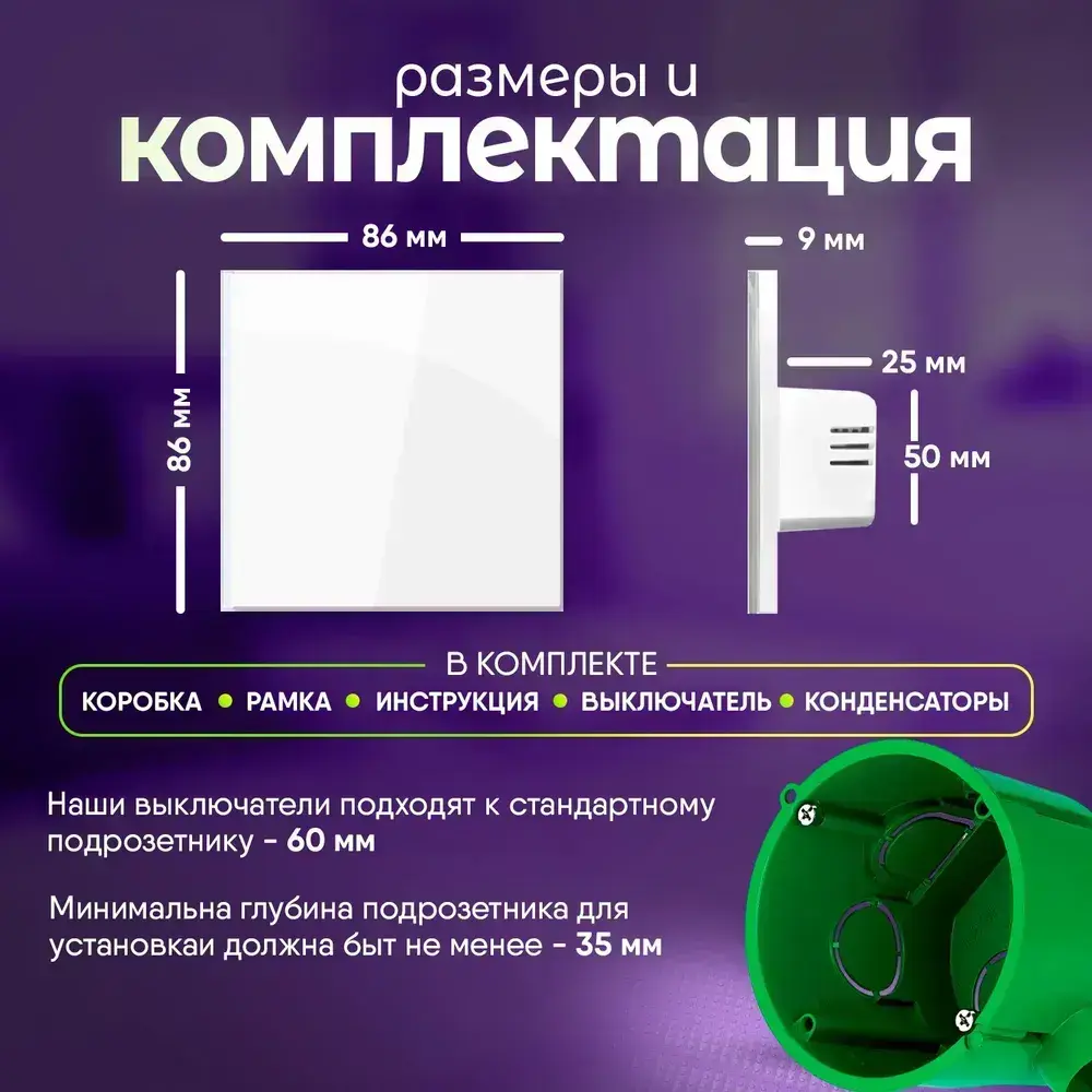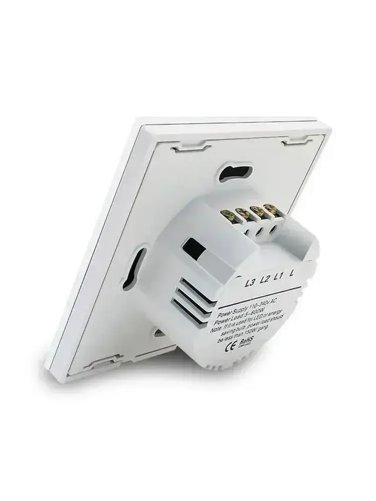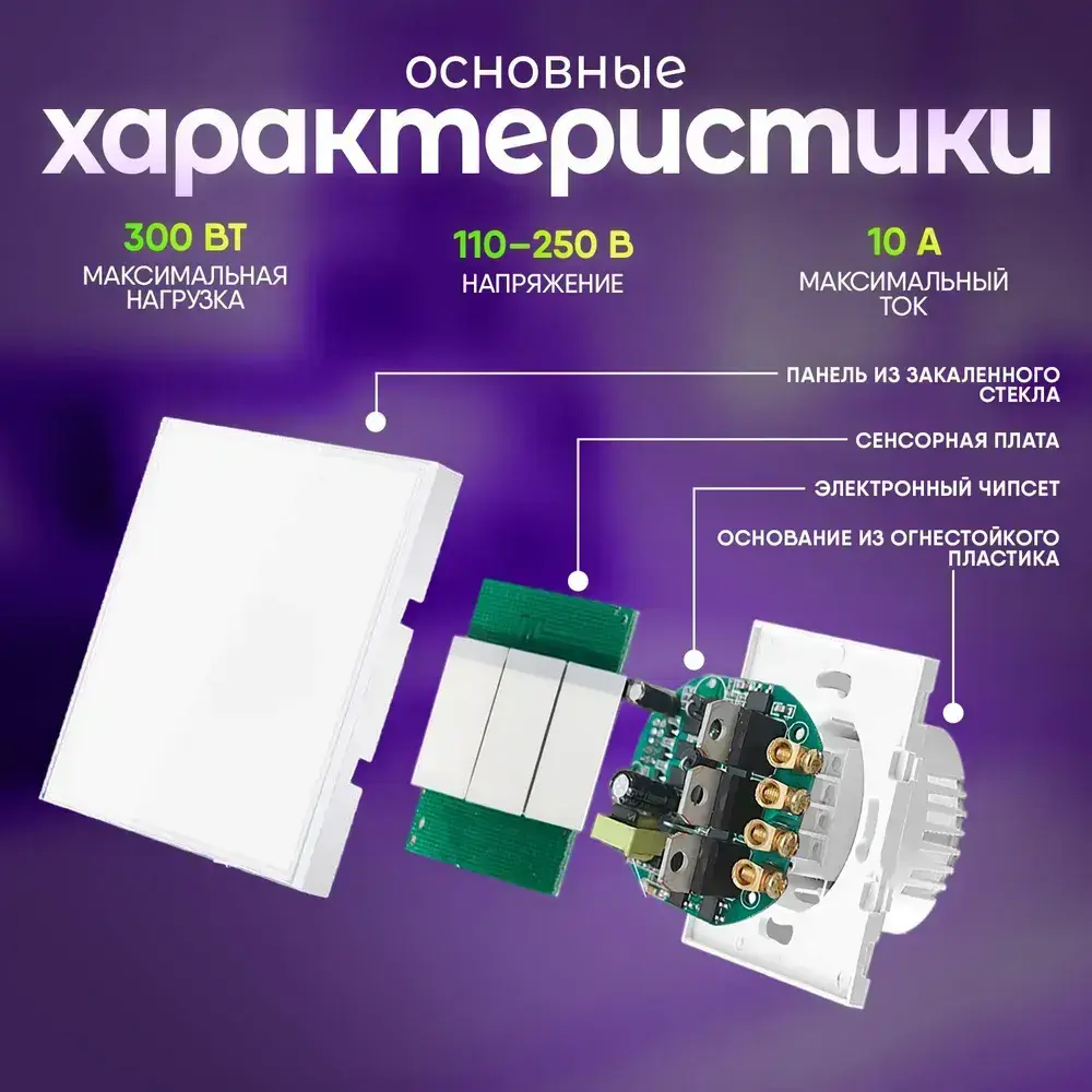 Сенсорный выключатель 2 сенсора, двухклавишный, панель из закаленного стекла с подсветкой, белый