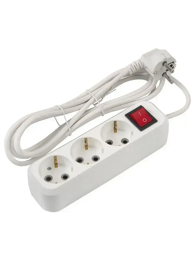 Сетевой бытовой удлинитель с заземлением и выключателем на 3 розетки кабель 1.5м, 16А, сечение кабеля 3x1мм , IP20 пластик АВS, цвет белый, Напрямую у производителя