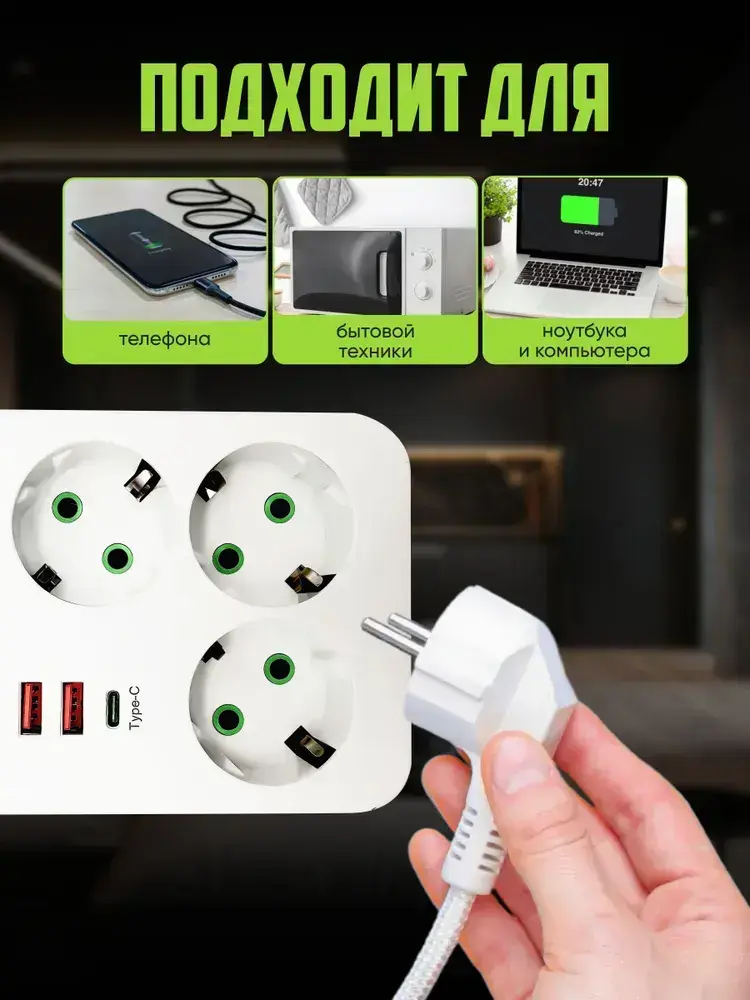 Сетевой фильтр 4 розетки, 5 метров удлинитель с usb пилот с type-c, Белый