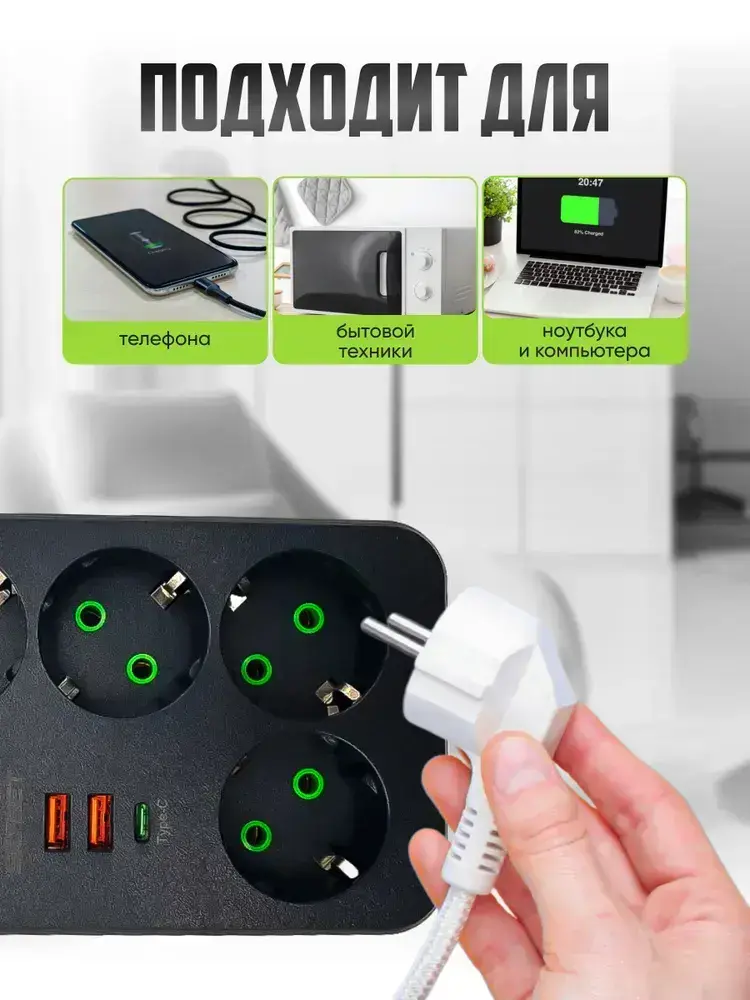Сетевой фильтр 4 розетки, 5 метров удлинитель с usb пилот с type-c, черный