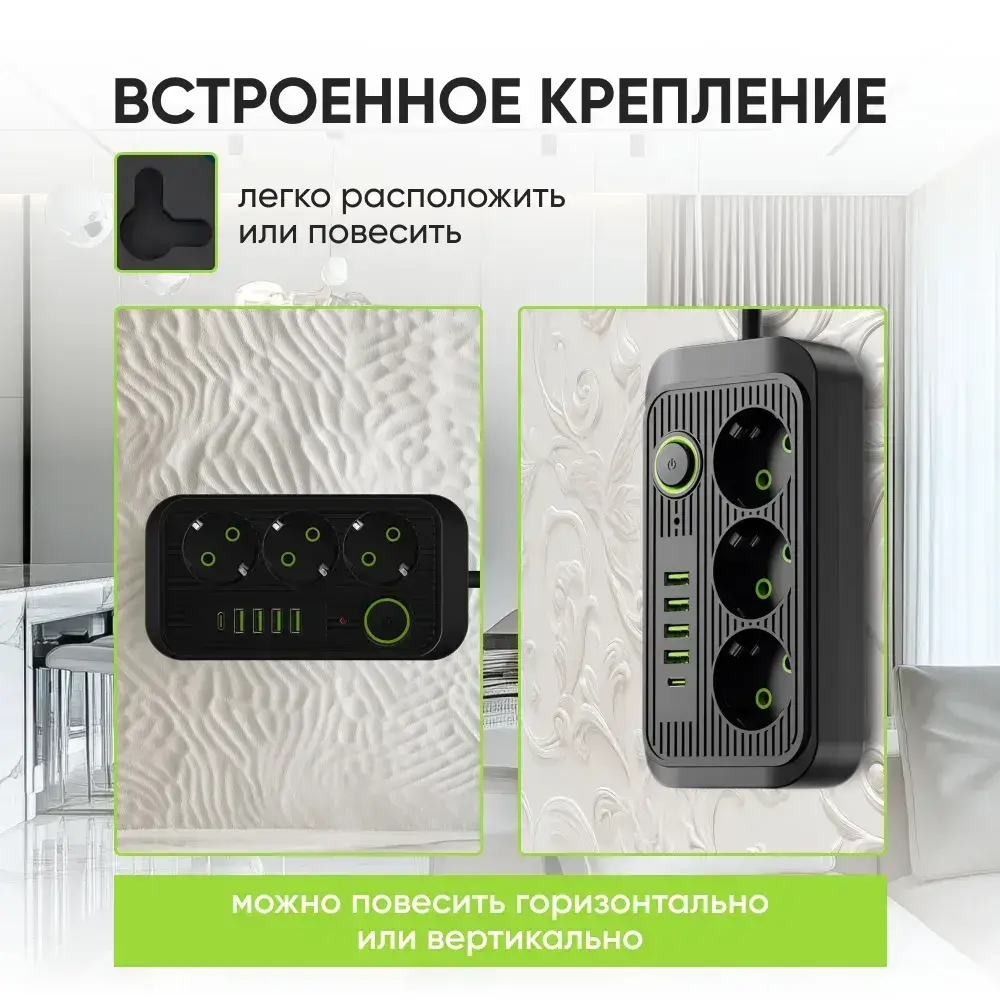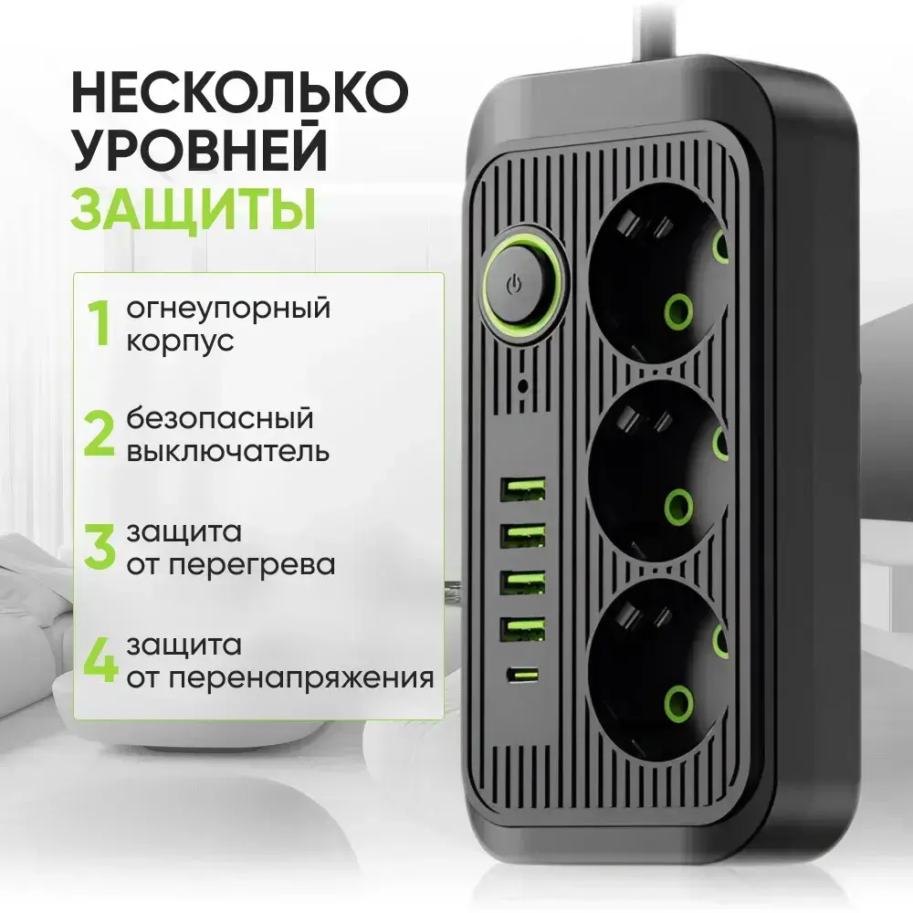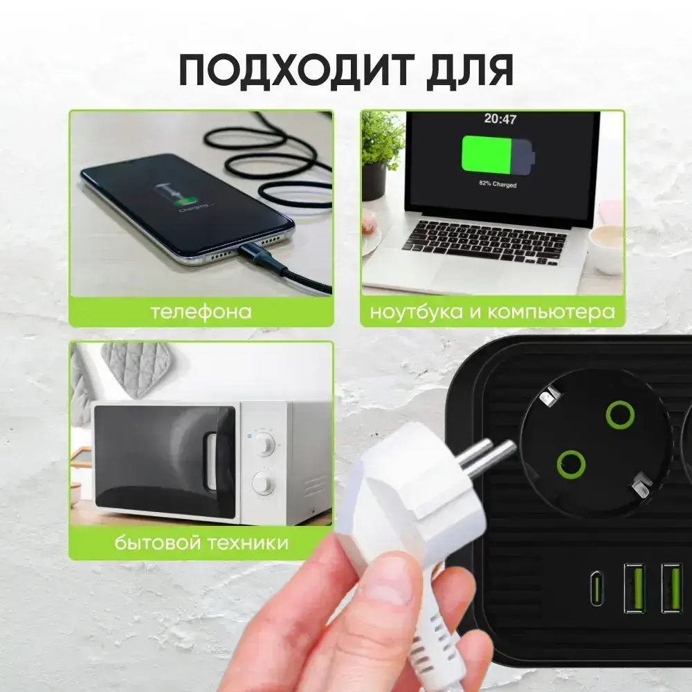 Сетевой фильтр 5 метров, на 3 розетки, удлинитель с usb пилот с type-c черный