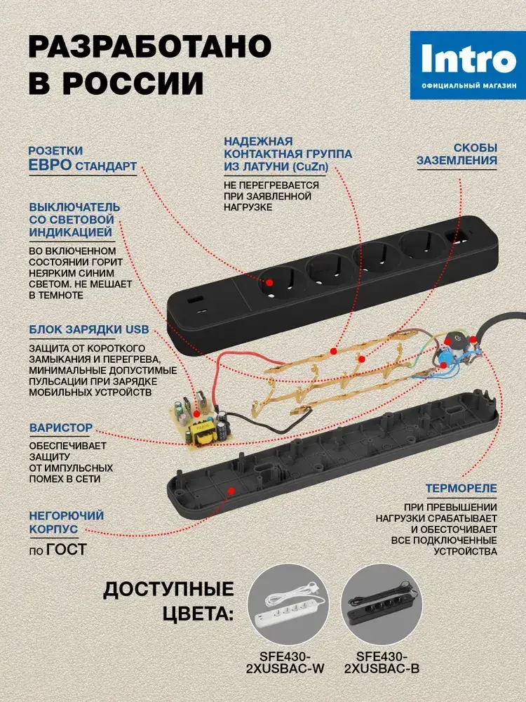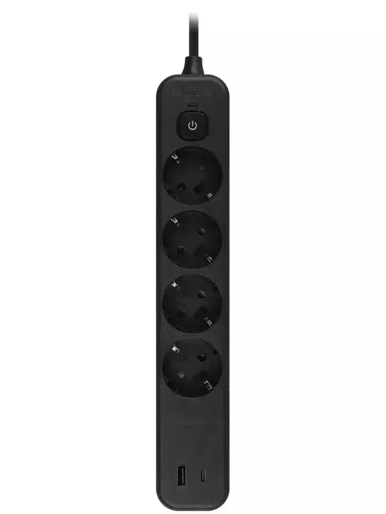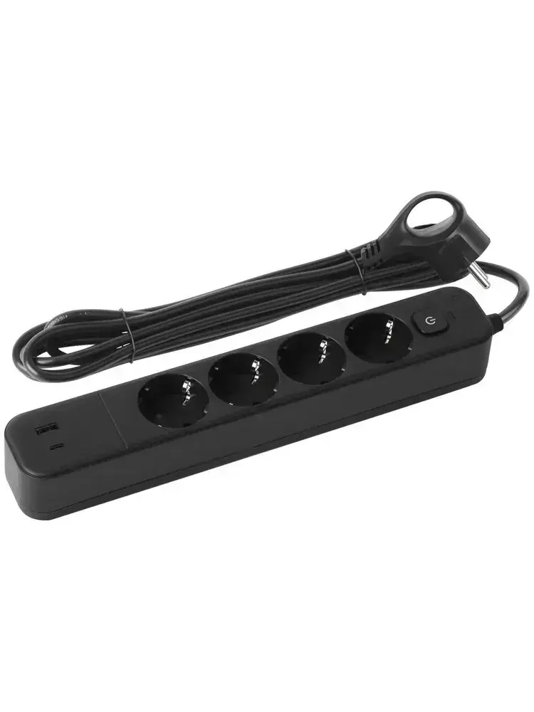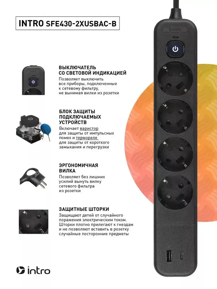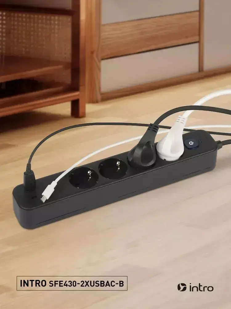 Сетевой фильтр Intro SFE430-2xUSBAC-B с базовой защитой с заземлением с выключателем 4 розетки+2xUSBA+C 3,1A 3м 10А / удлинитель сетевой 3м