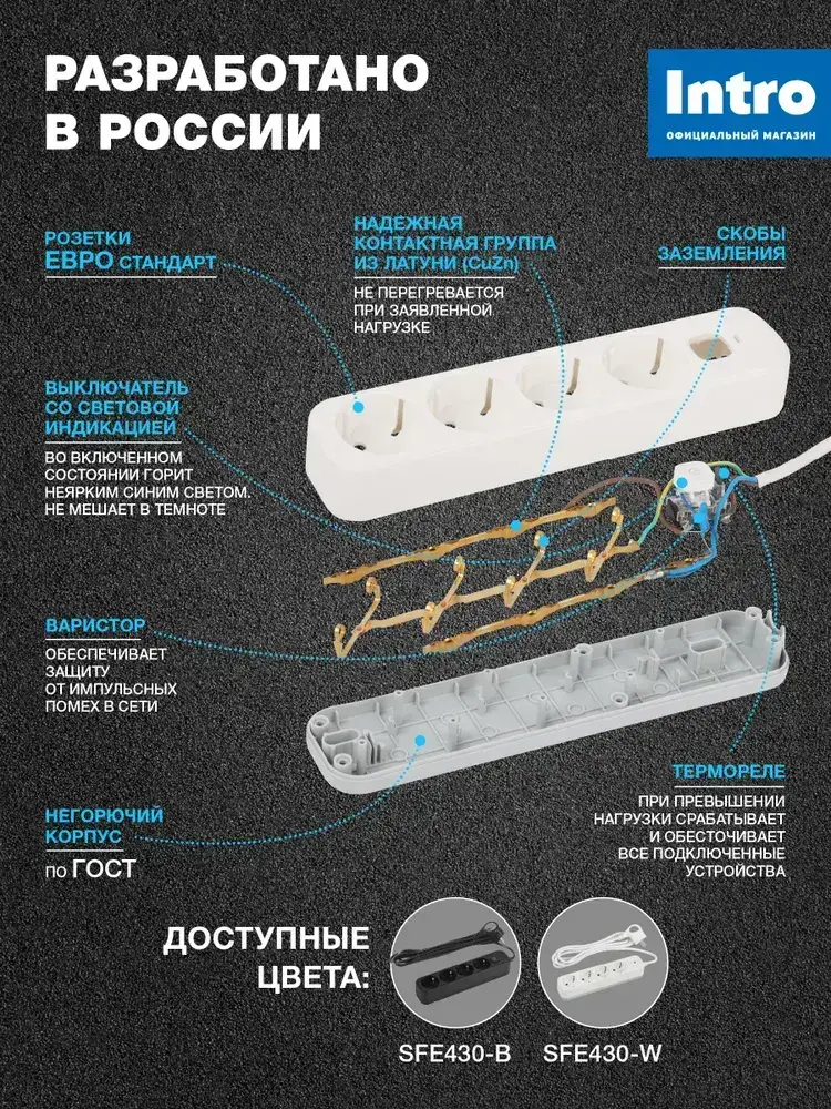 Сетевой фильтр Intro SFE430-W с базовой защитой с заземлением с выключателем 4 розетки 3м 10А белый / удлинитель сетевой 3м