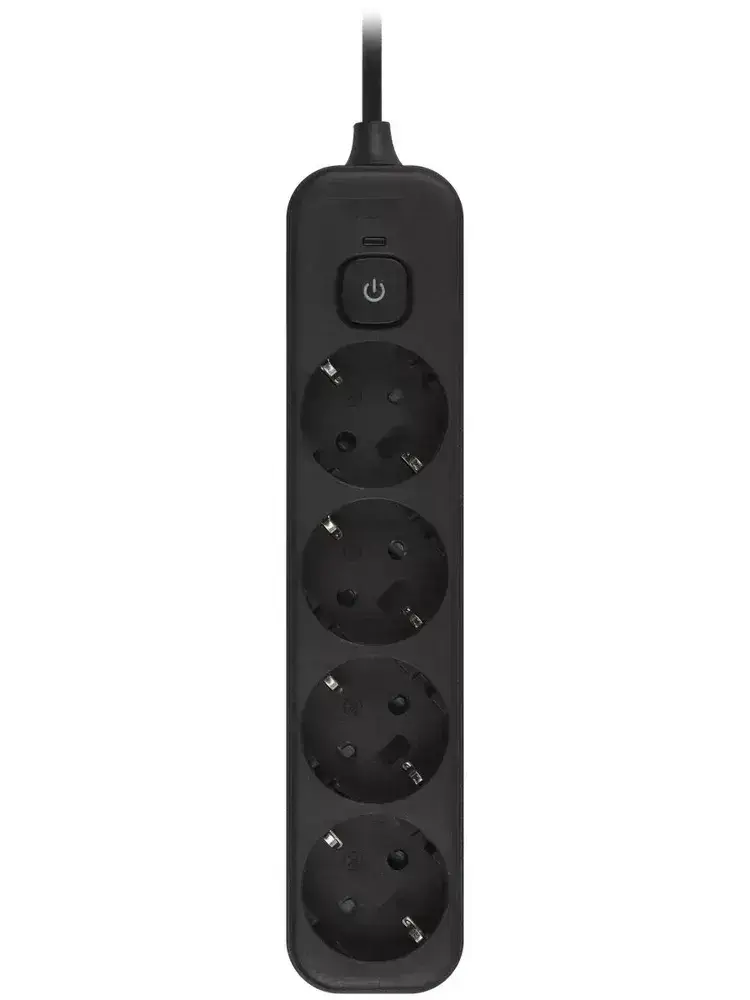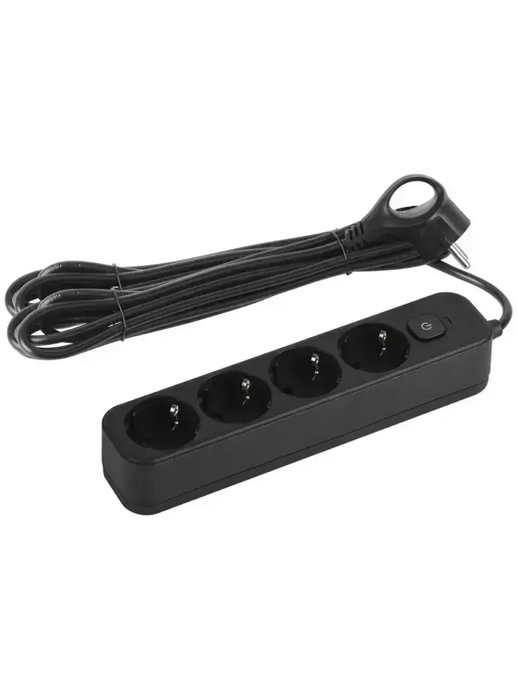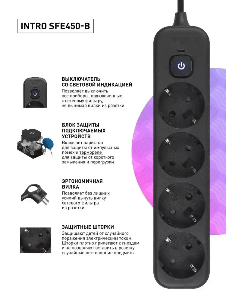Сетевой фильтр Intro SFE450-B с базовой защитой с заземлением с выключателем 4 розетки 5м 10А черный / удлинитель сетевой 5м