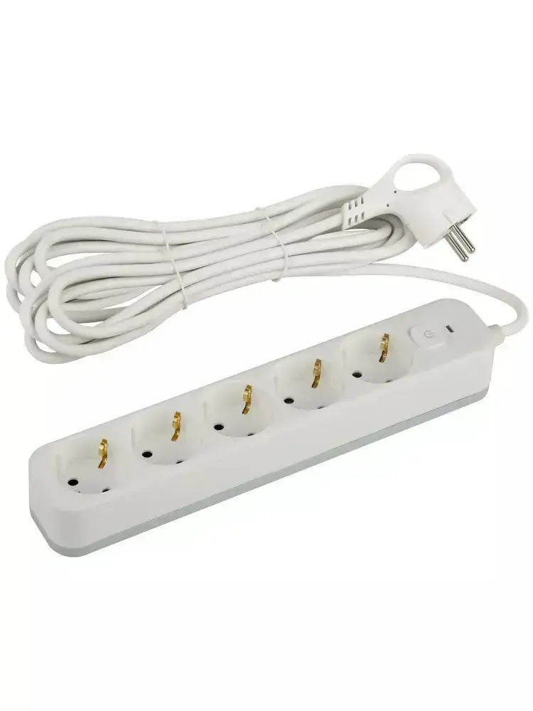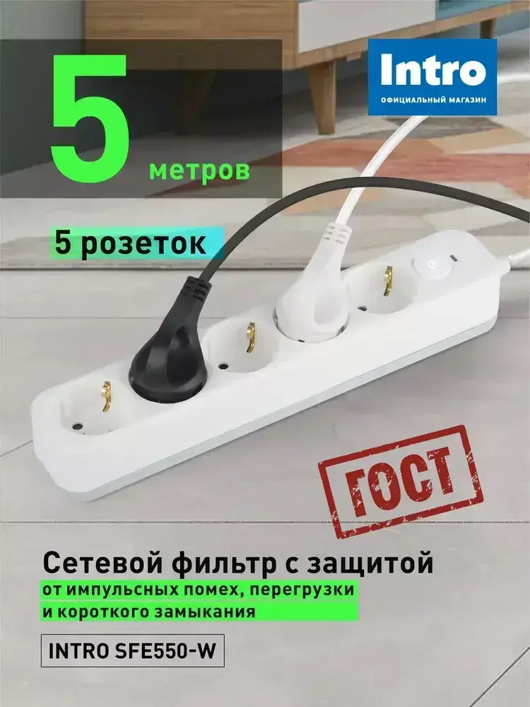Сетевой фильтр Intro SFE550-W с базовой защитой с заземлением с выключателем 5 розеток 5м 10А белый / удлинитель сетевой 5м