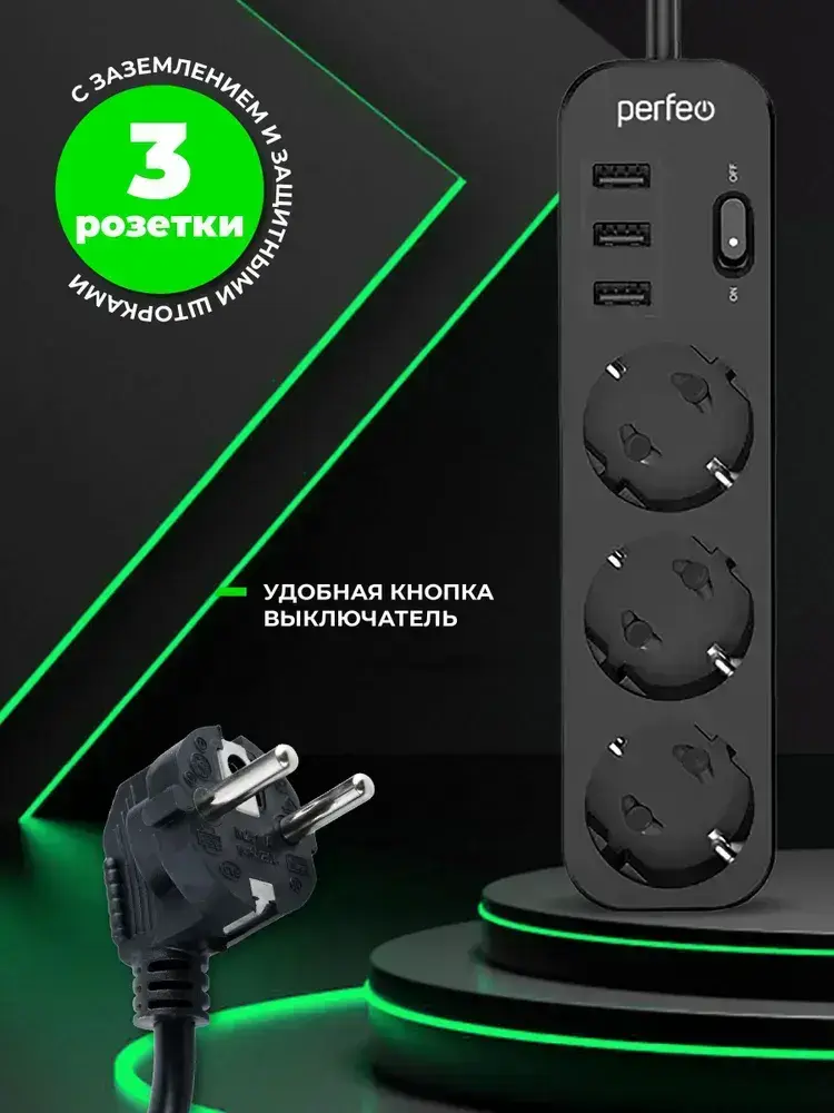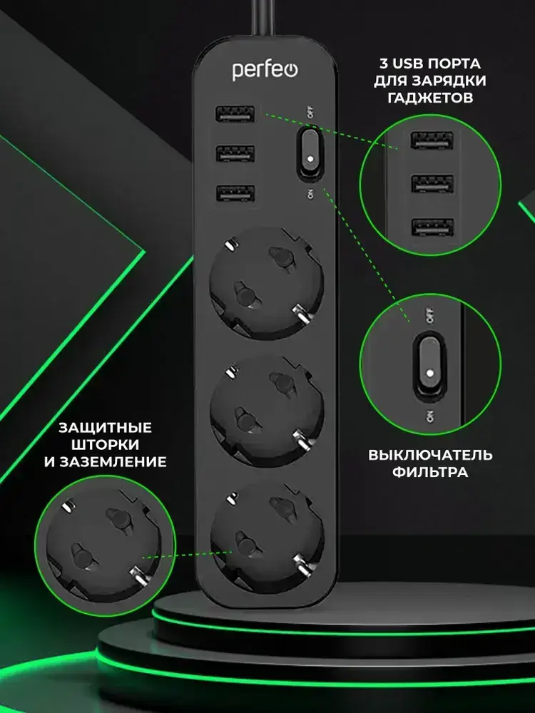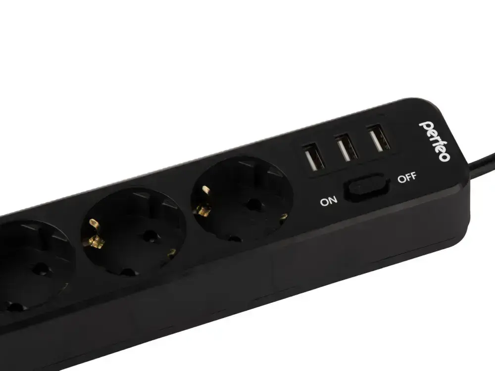 Сетевой фильтр Perfeo "POWER STREAM", 2500W, двойная защита, 2м, 3 розетки, 3 USB, черный.