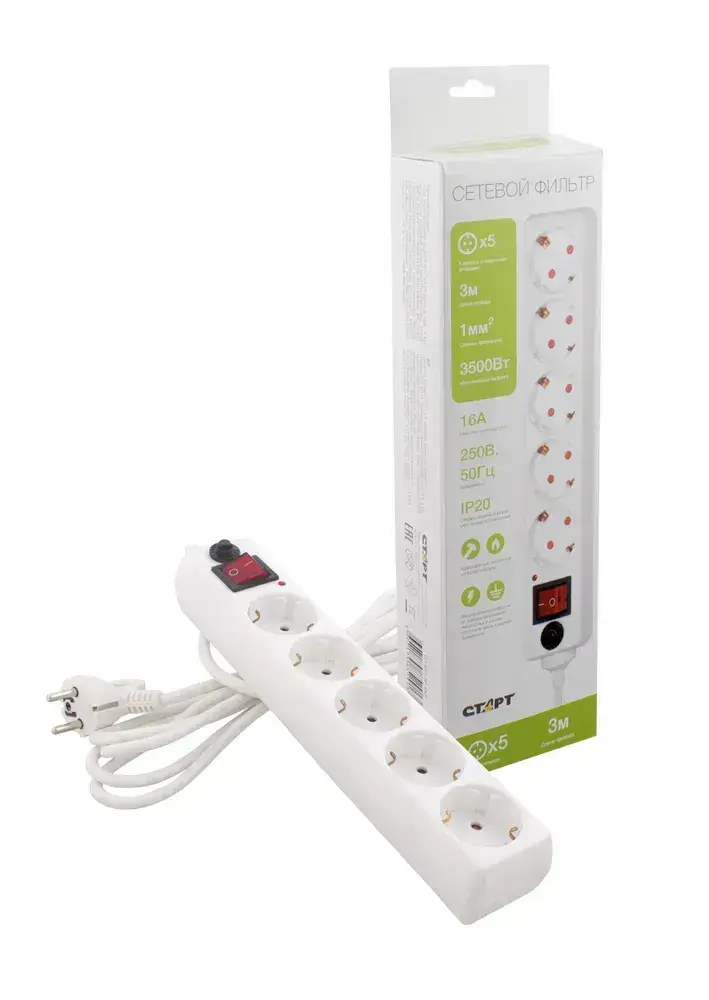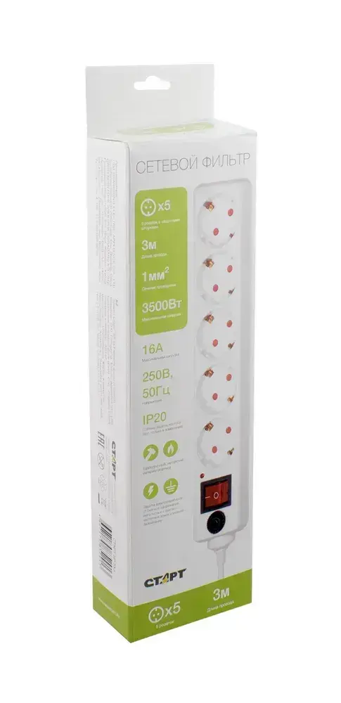 Сетевой фильтр с предохранителем 3м 5 розеток СТАРТ удлинитель бытовой с заземлением, защита от перегрузки и короткого замыкания