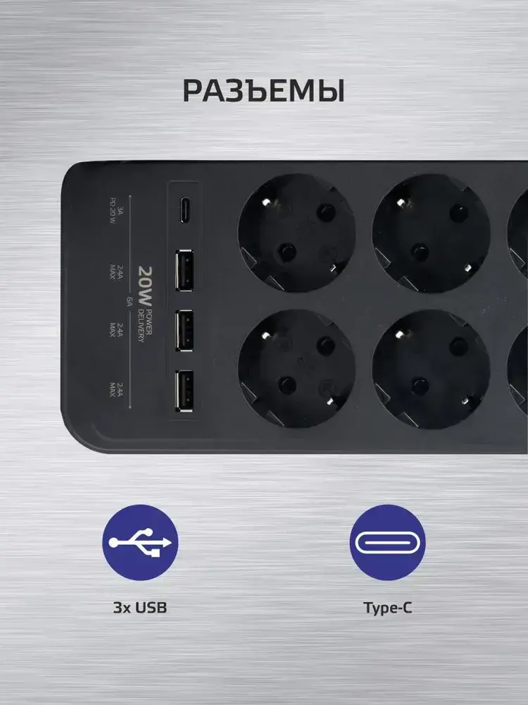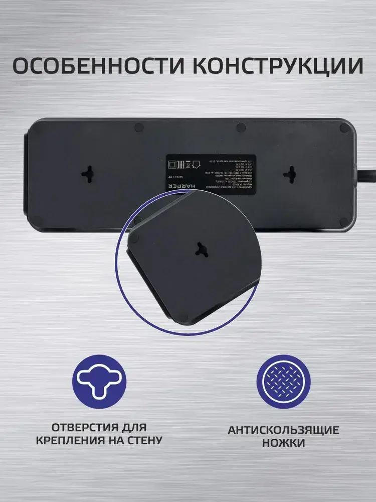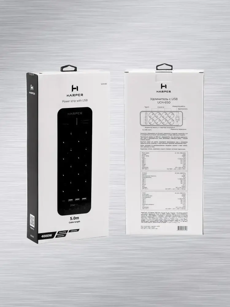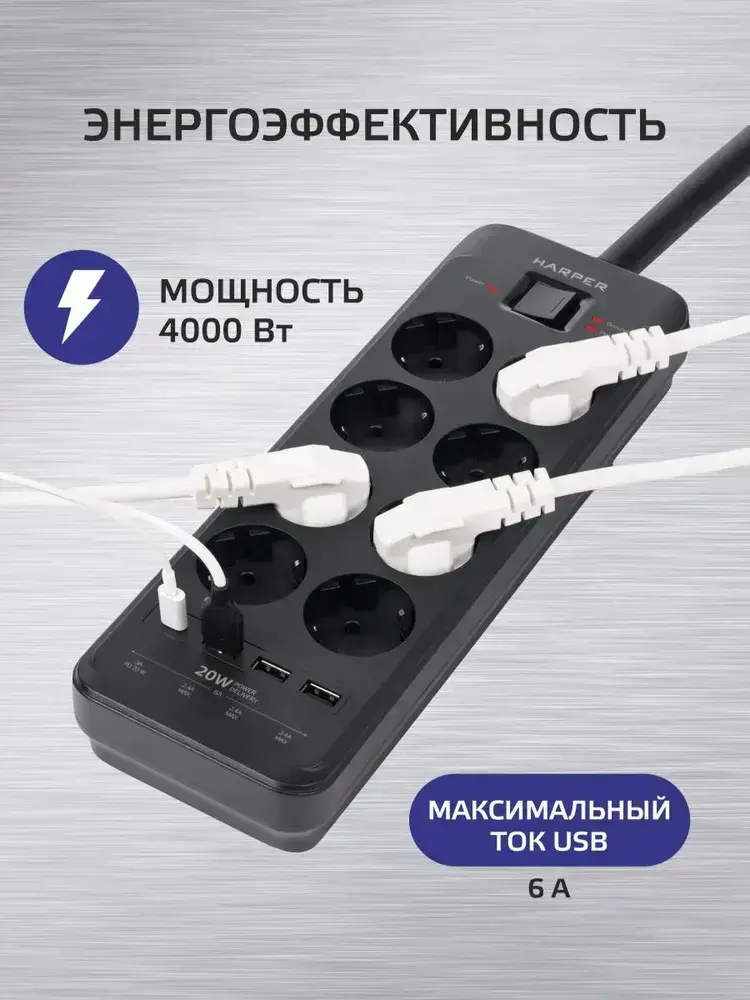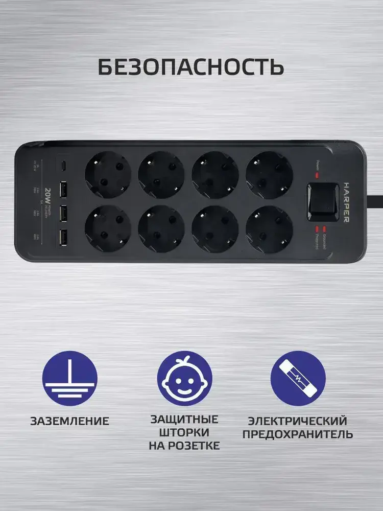 Сетевой фильтр с предохранителем HARPER UCH-650, 8 розеток, 3 USB + 1 type-C с поддержкой power delivery, кабель 5 метров, 4000 Вт, 16А, черный