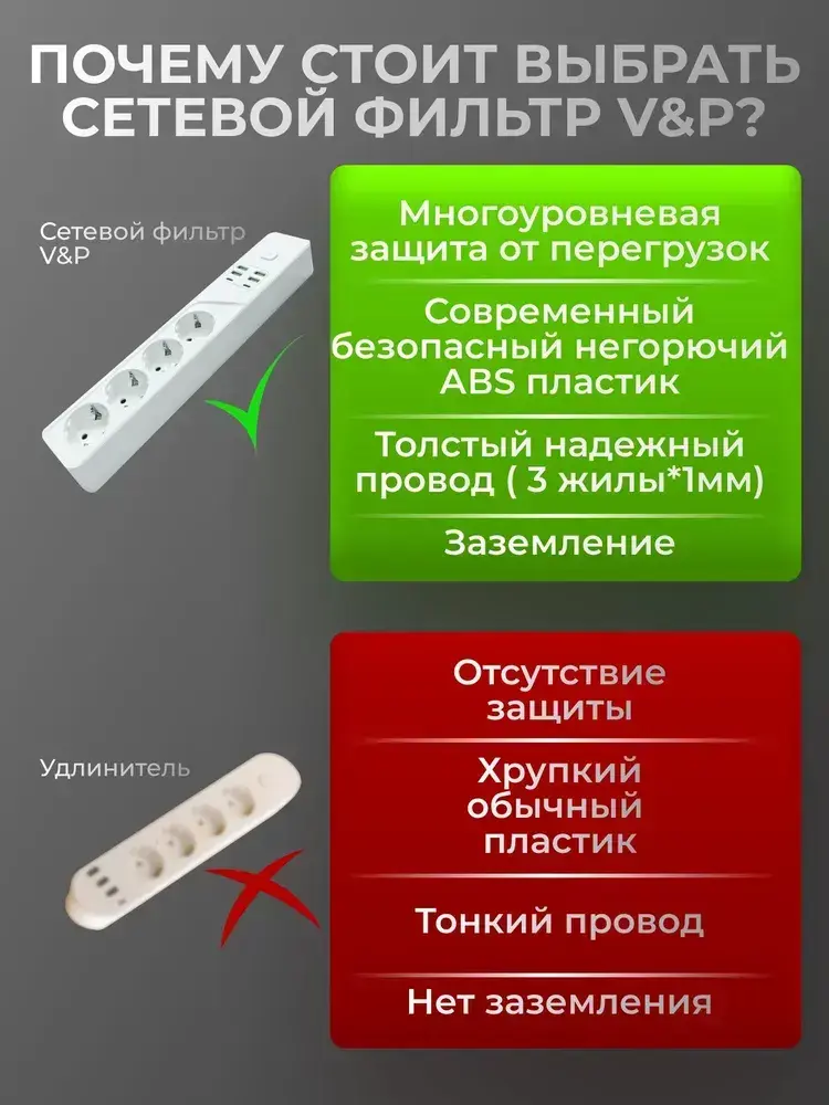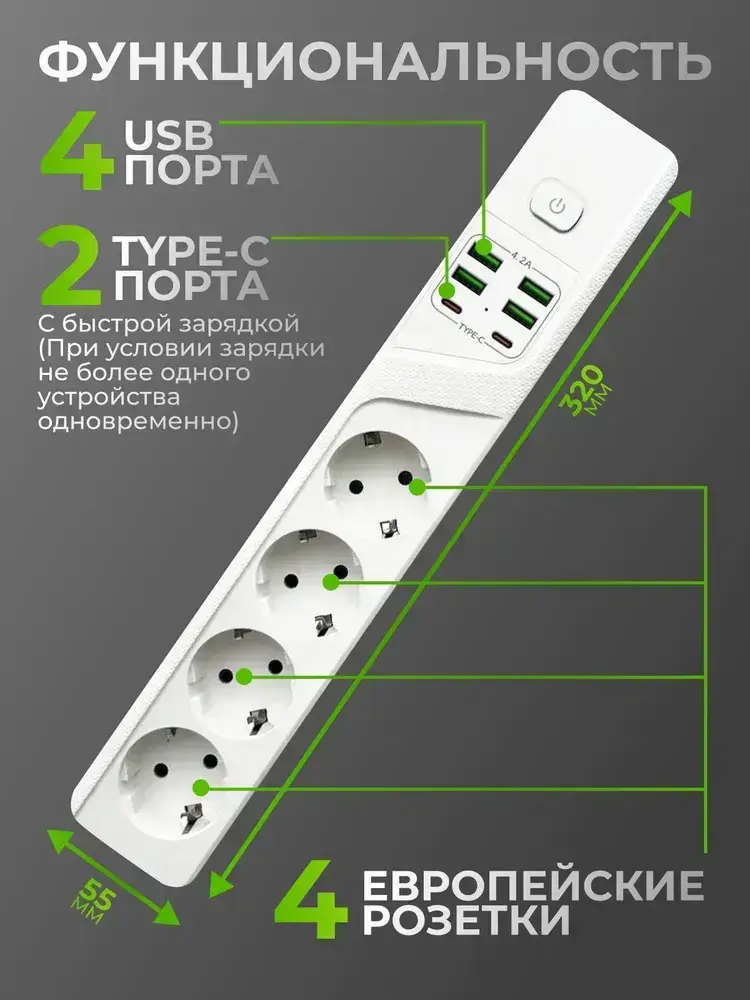 Сетевой фильтр, с предохранителем, с USB и TYPE-C, пилот для компьютера 4 розетки с заземлением белый 2 метра
