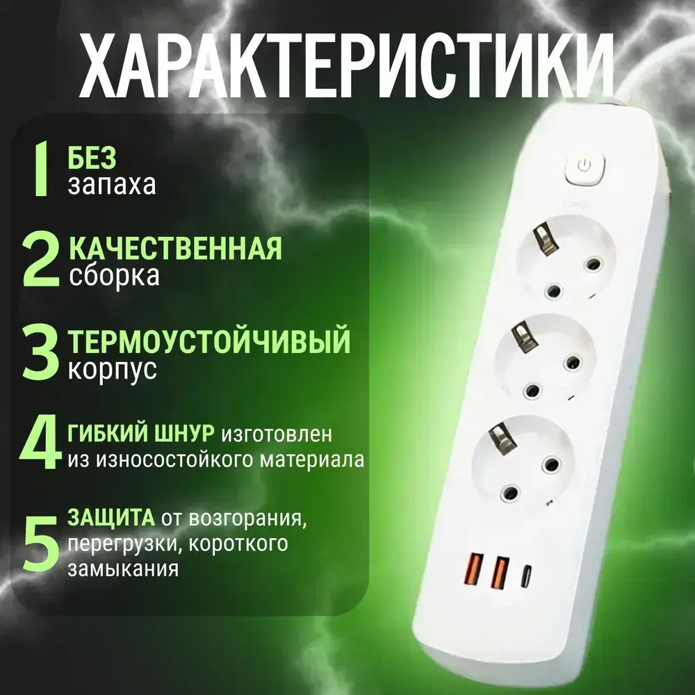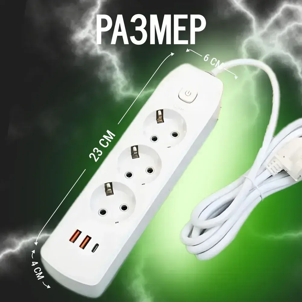 Сетевой фильтр с предохранителем с USB портом и typec VISUAL, удлинитель с быстрой зарядкой 2 метра белый
