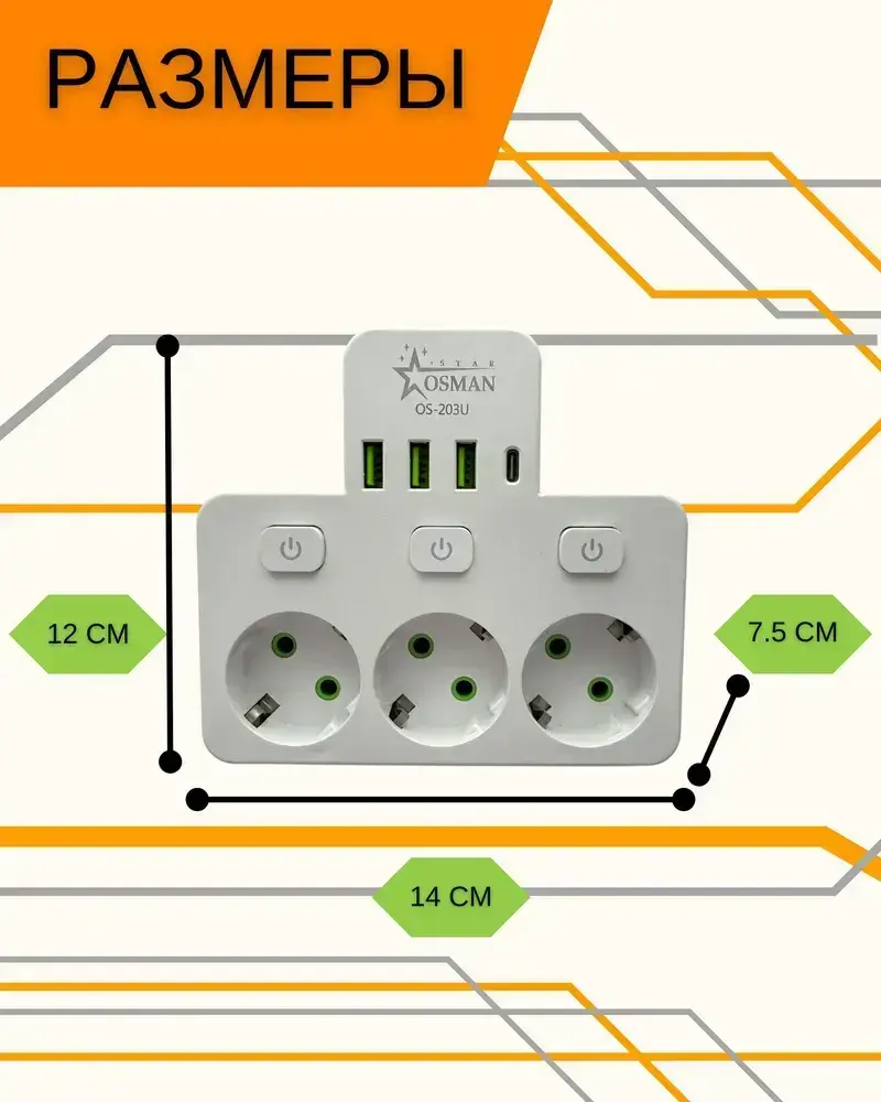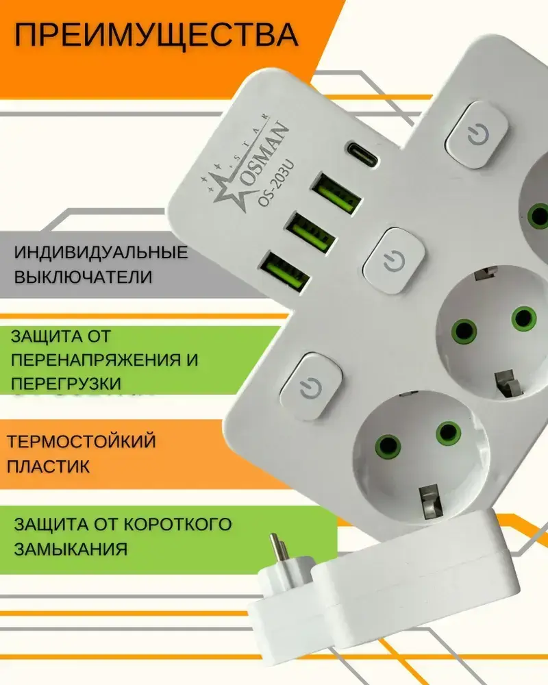 Сетевой фильтр Тройник для розетки плоский с USB и Type-C разветвитель электрический с выключателями