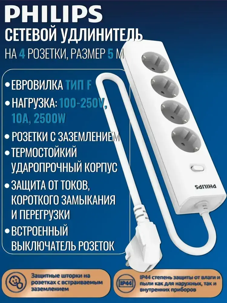 Сетевой фильтр удлинитель Philips CHP2145WC/51 с четырьмя стандартными розетками EU, с заземлением и защитой от перегрузок, 5 м, белый
