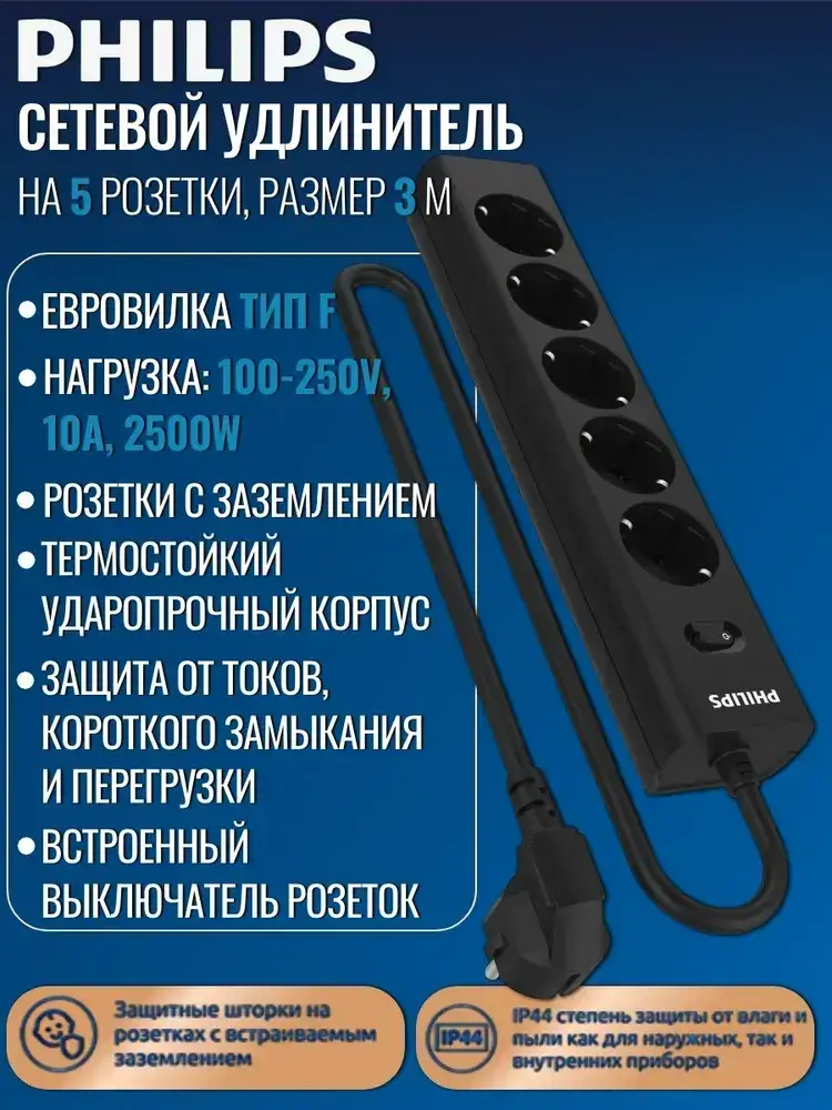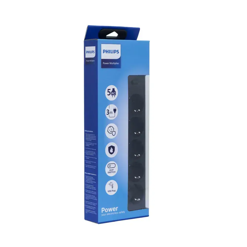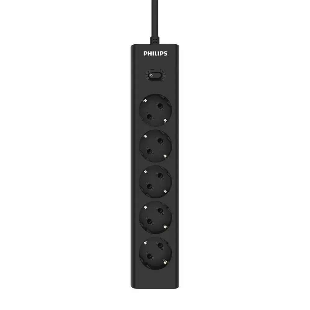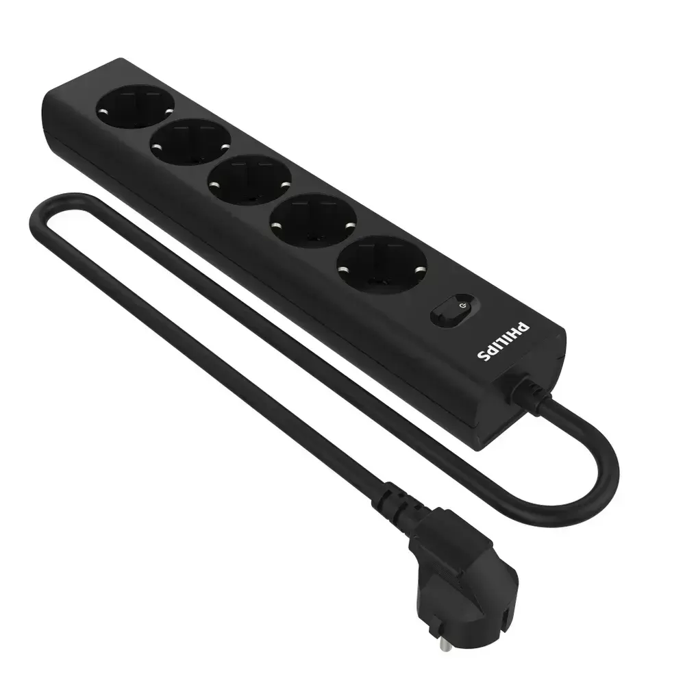 Сетевой фильтр удлинитель Philips CHP2155BB/51 с пятью стандартными розетками EU, с заземлением и защитой от перегрузок, 3 м, черный