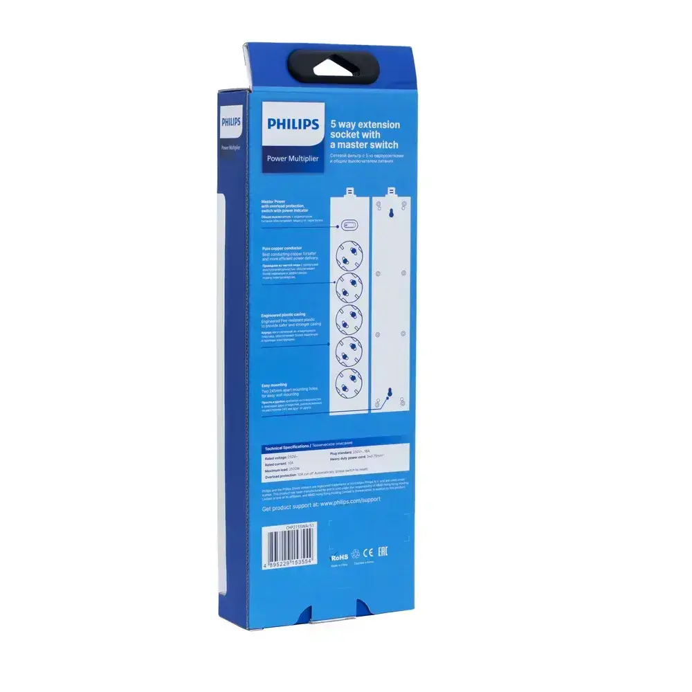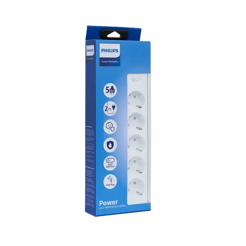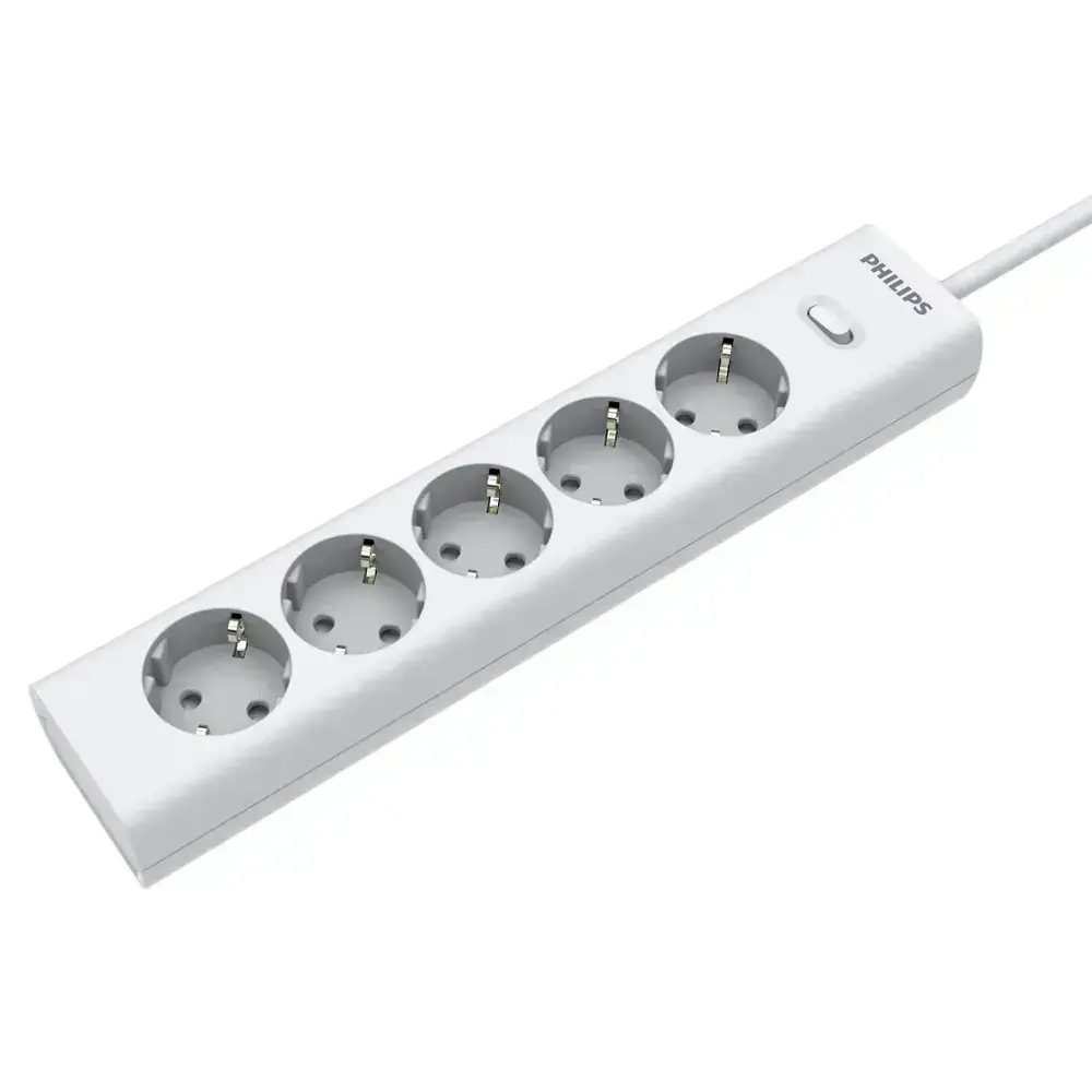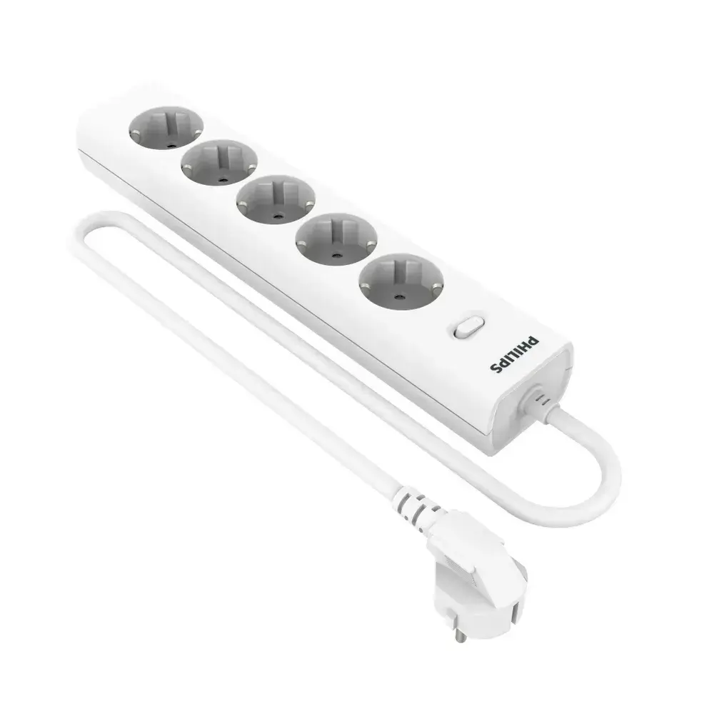 Сетевой фильтр удлинитель Philips CHP2155WA/51 с пятью стандартными розетками EU, с заземлением и защитой от перегрузок, 2 м, белый