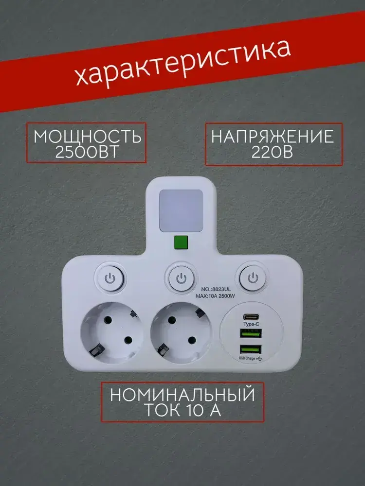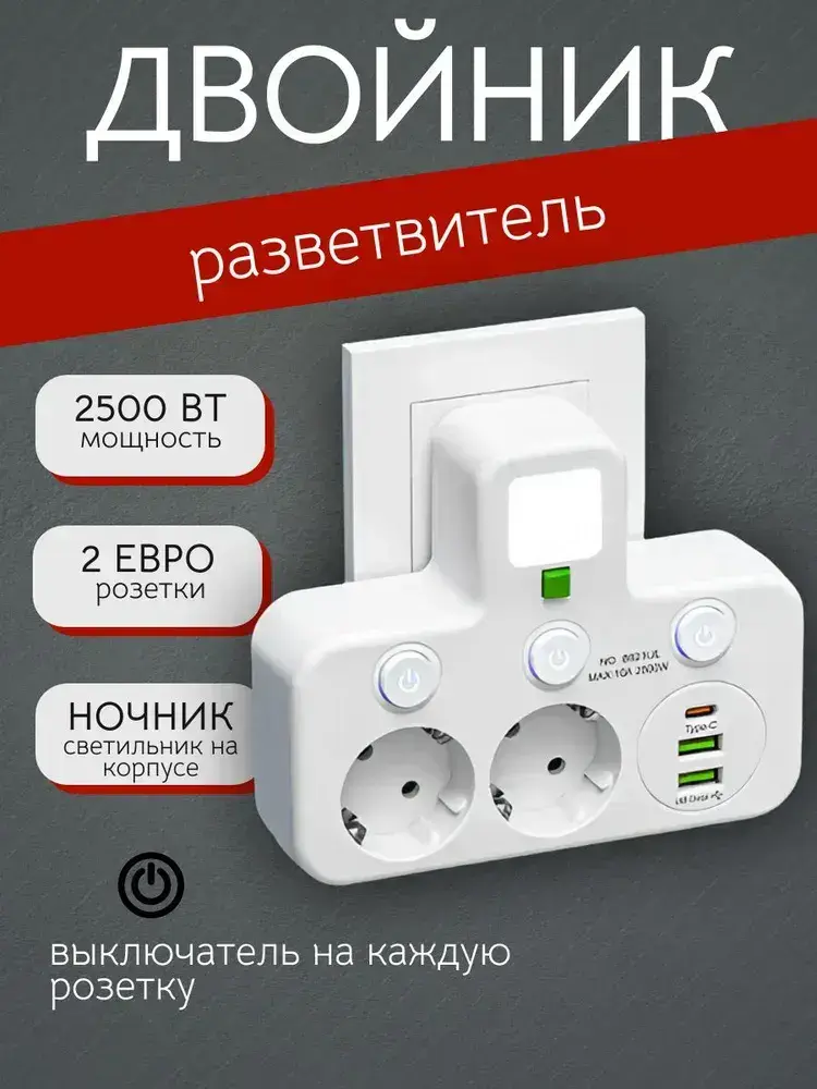 Сетевой разветвитель на 2 розетки, с USB и Type-C, с функцией ночника