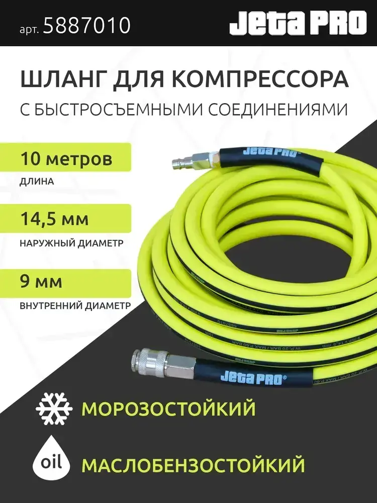 Шланг для компрессора воздушного 10 м, резиновый, с быстросъемными соединениями, желтый, JetaPro 5887010
