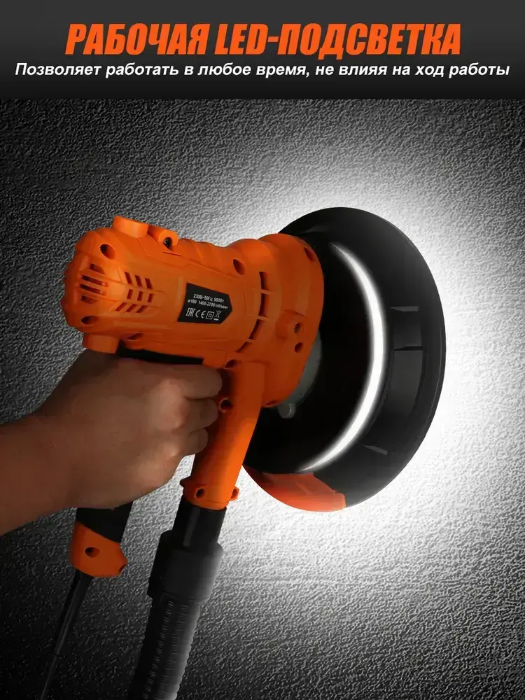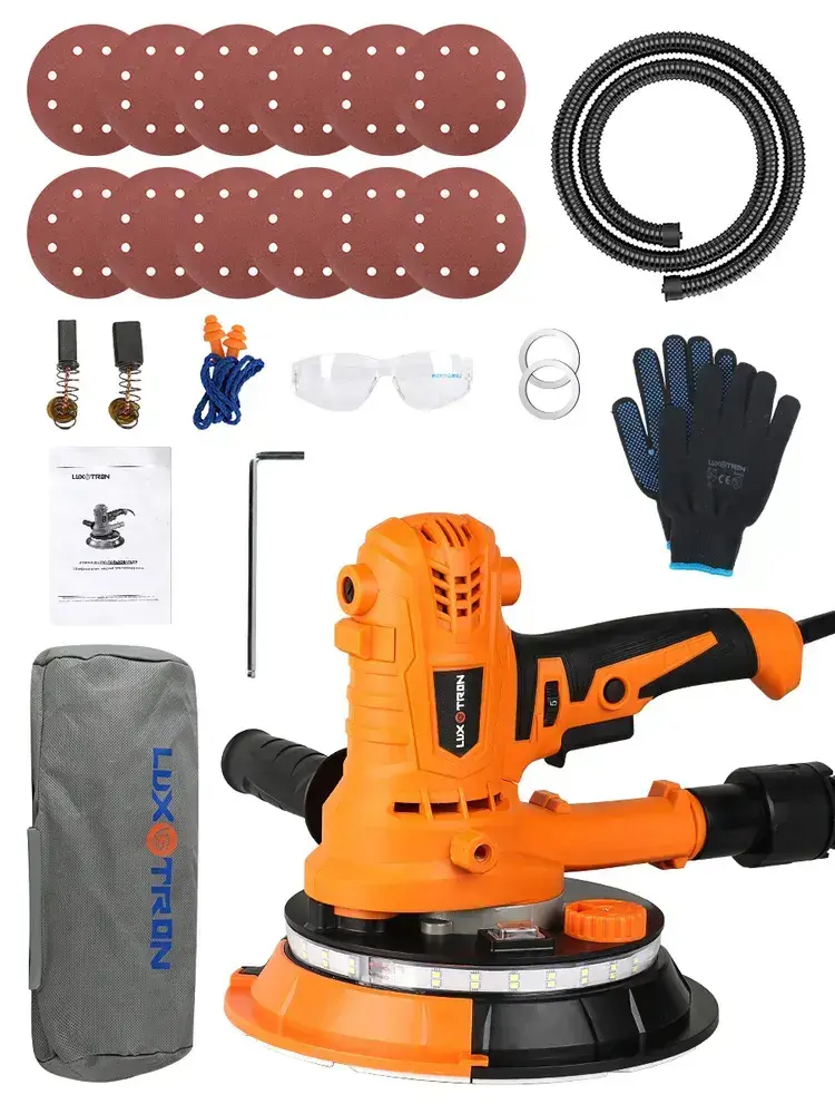 Шлифовальная машинка для стен и потолков Luxotron, 900Вт, 1400 - 2700 об/мин, 12 штук шлифовальных бумаг, 4 м сетевой шнур, LED