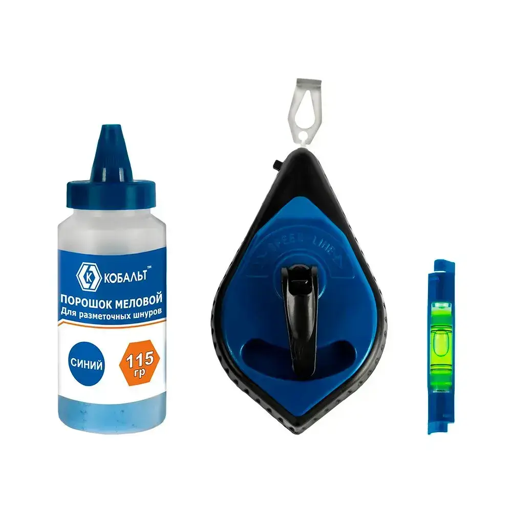 Шнур разметочный КОБАЛЬТ 30 метров + меловой порошок + уровень.