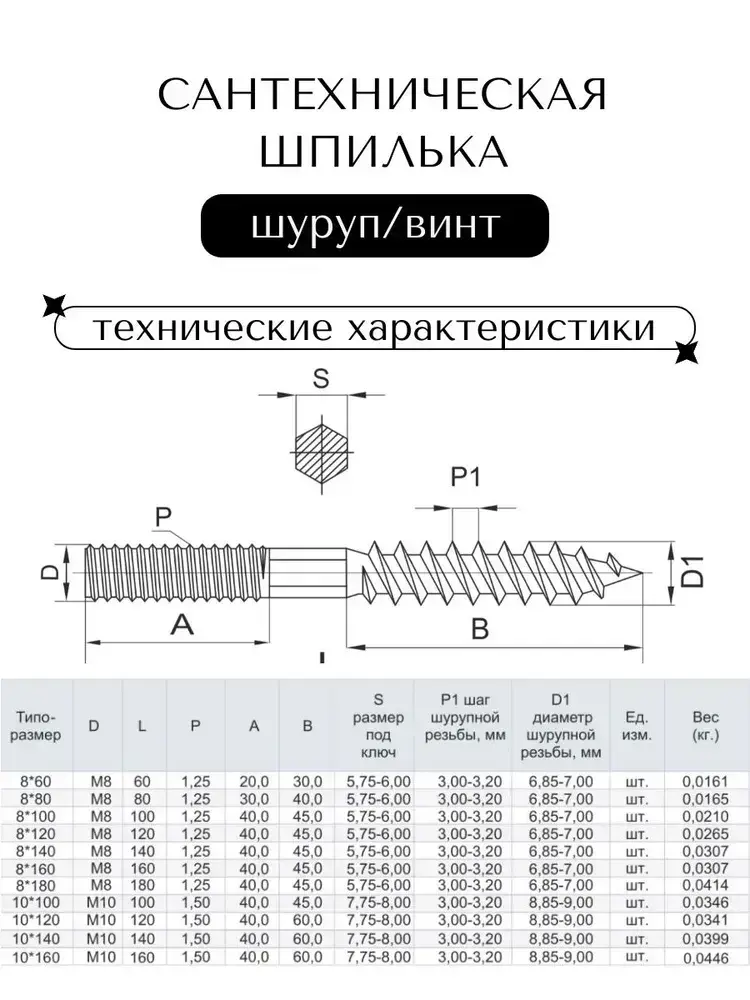 Шпилька сантехническая М8*60, 10 штук