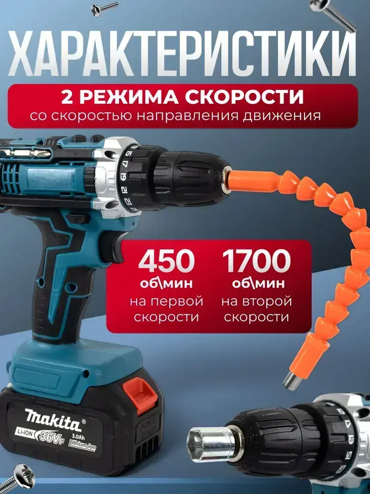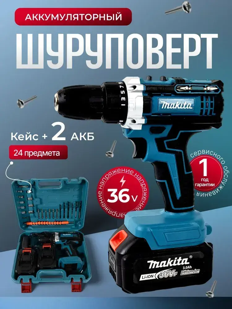 Шуруповерт аккумуляторный 36В / 2 АКБ / набор 24 Предмета