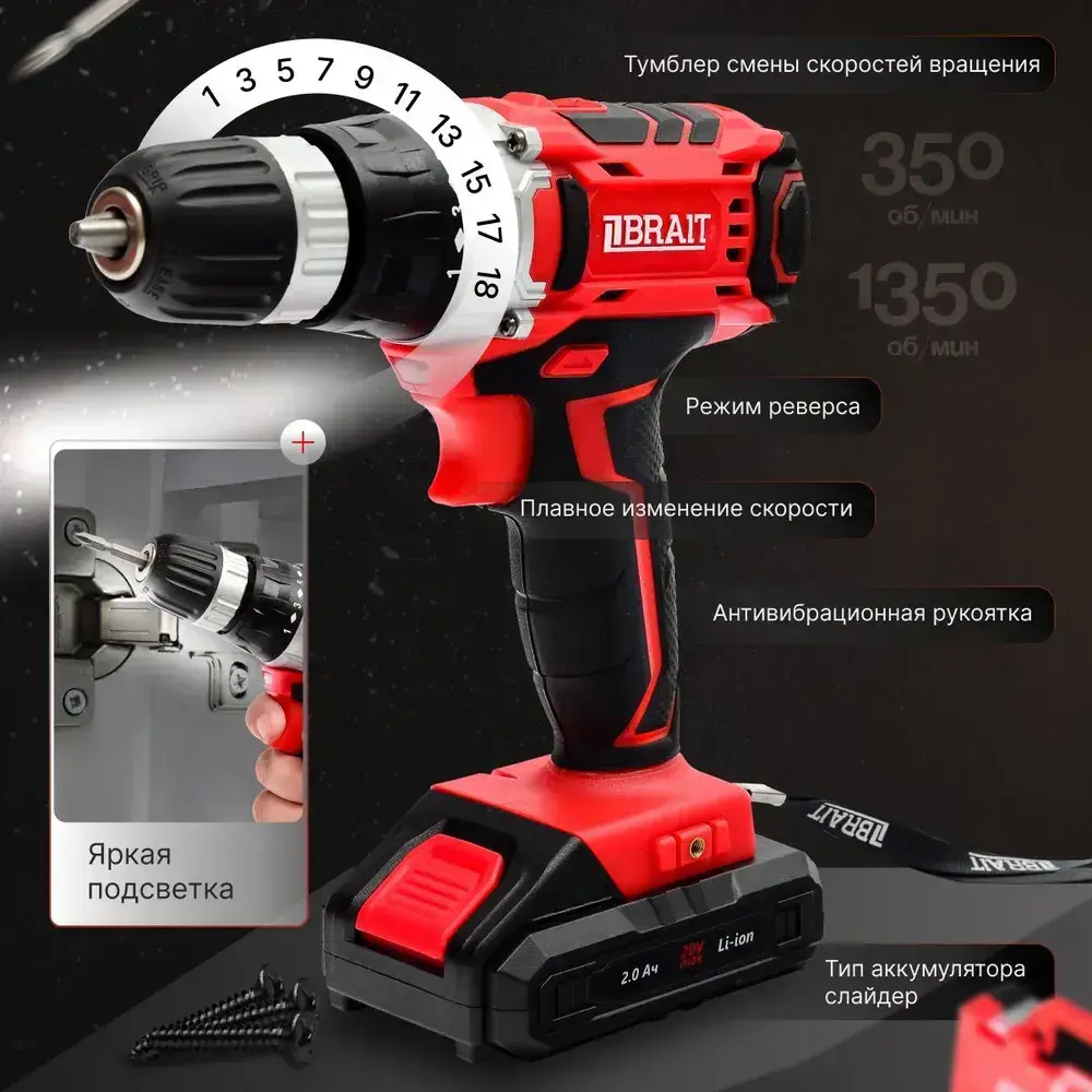 Шуруповерт аккумуляторный / дрель аккумуляторная BRAIT BCD20S (18 В, 2 А*ч, 2 АКБ, 30 Нм, Li-Ion, КЕЙС, Подсветка )