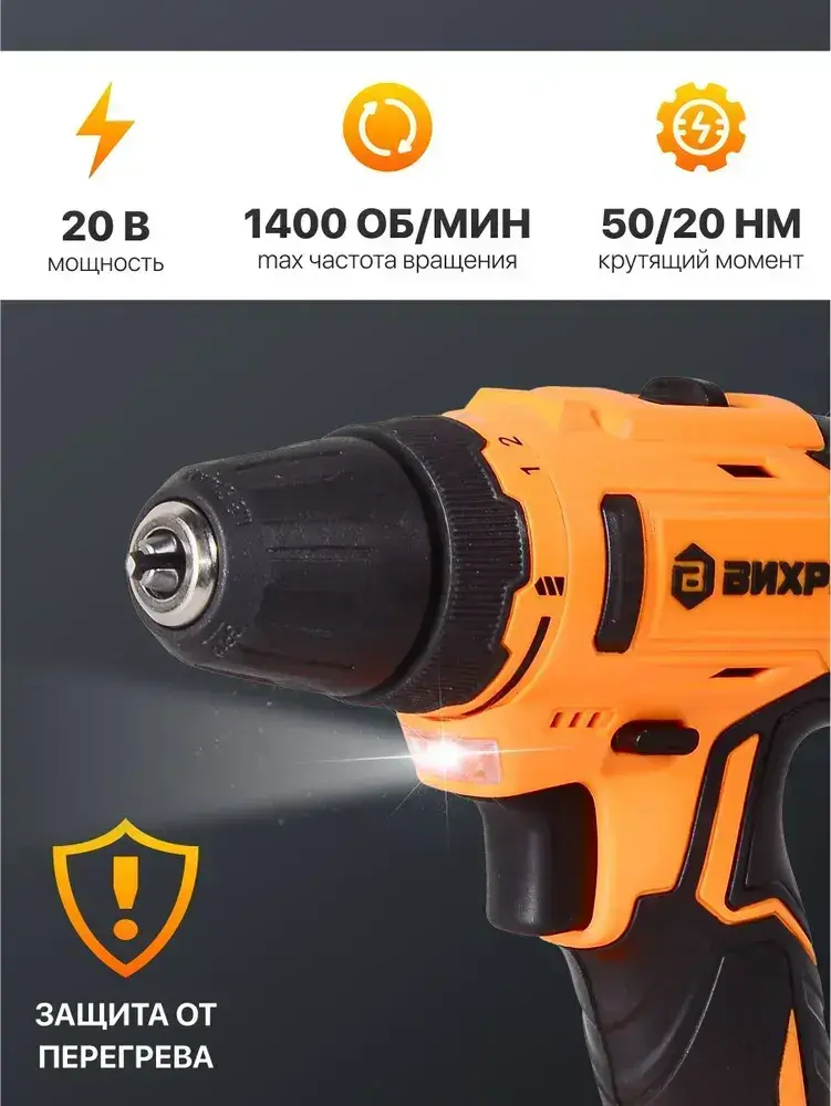 Шуруповерт аккумуляторный ВИХРЬ ДА-20Л-2К, 20V/ 2АКБ