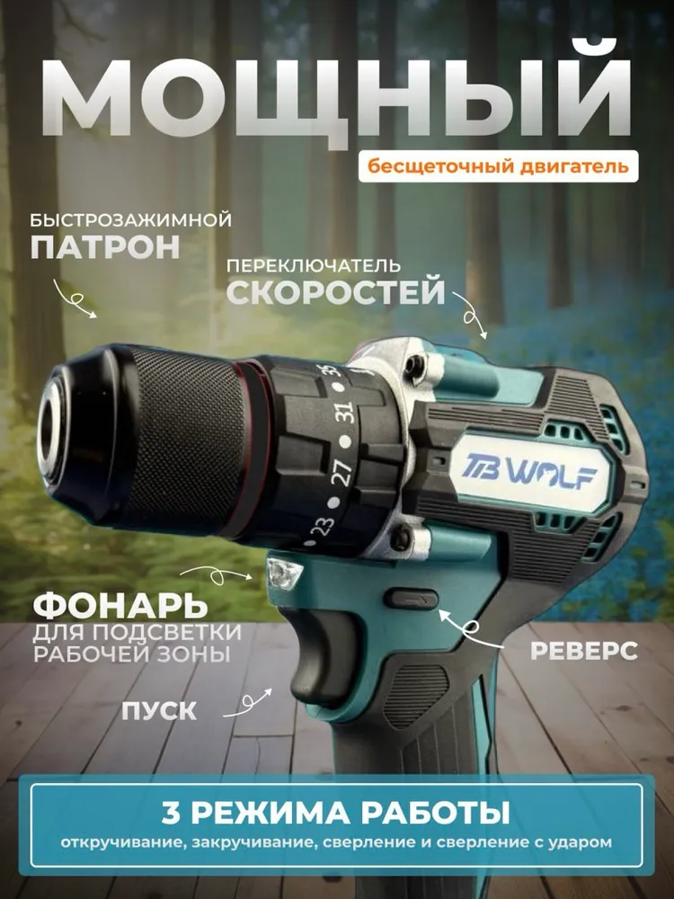 Шуруповерт дрель аккумуляторный бесщеточный TibWolf мощные АКБ в кейсе 21В с набором инструментов 2 АКБ