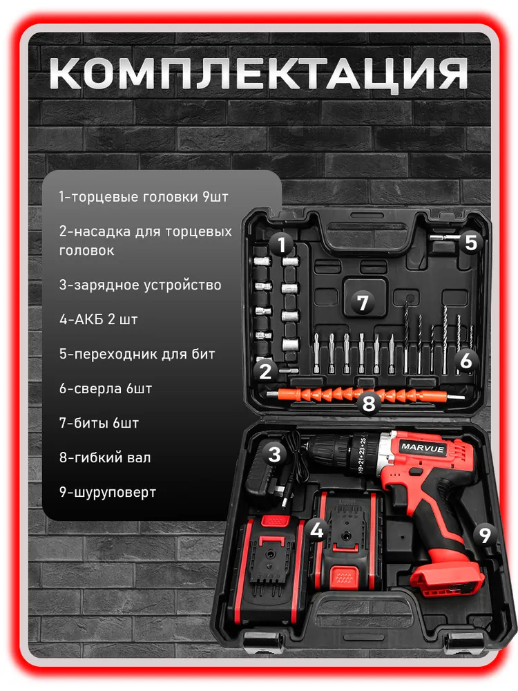 Шуруповерт дрель аккумуляторный ударный 48В, в кейсе, 2 АКБ 4 а/ч, 24 насадки и зарядная станция в наборе Черный, красный