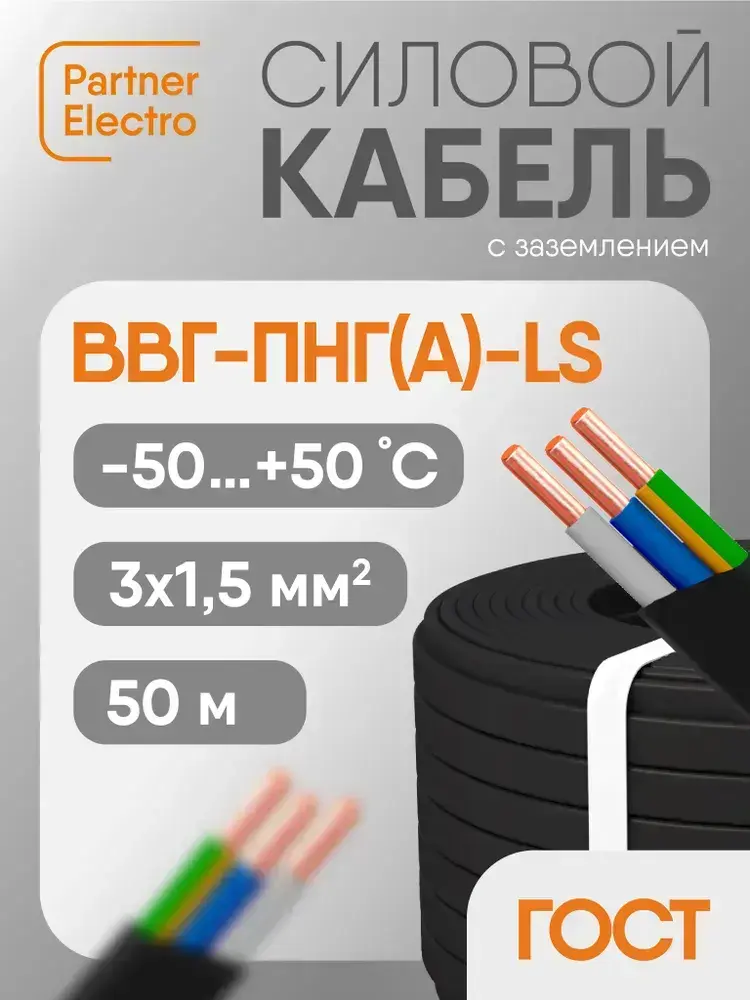 Силовой кабель ВВГ-Пнг(А)-LS 3х1,5 кв.мм, 50 м, Партнер-Электро