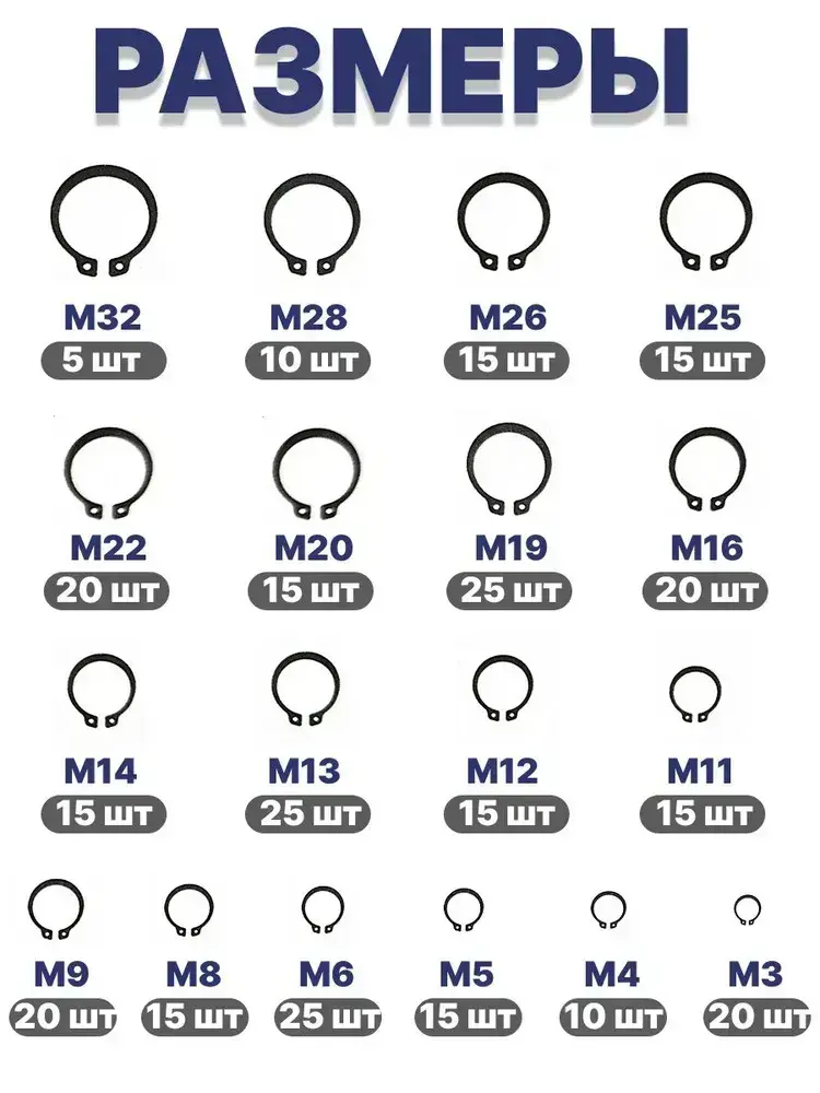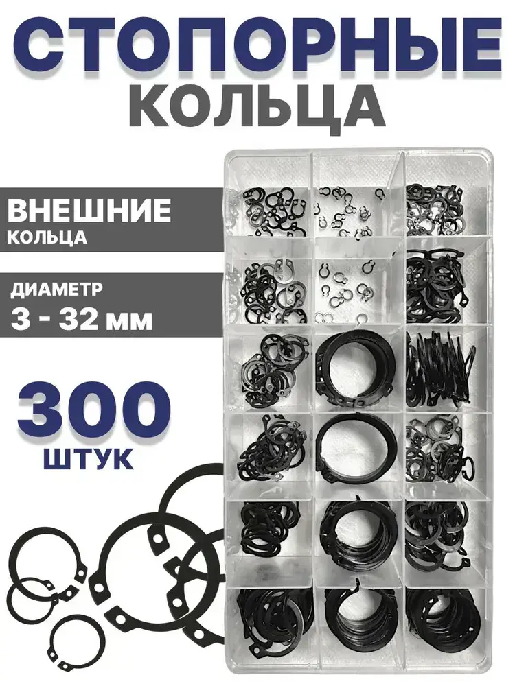 Стопорные кольца набор 3-32 мм 300 шт/ 18 видов, внешние кольца