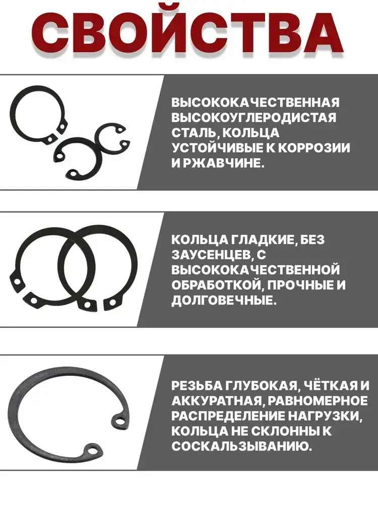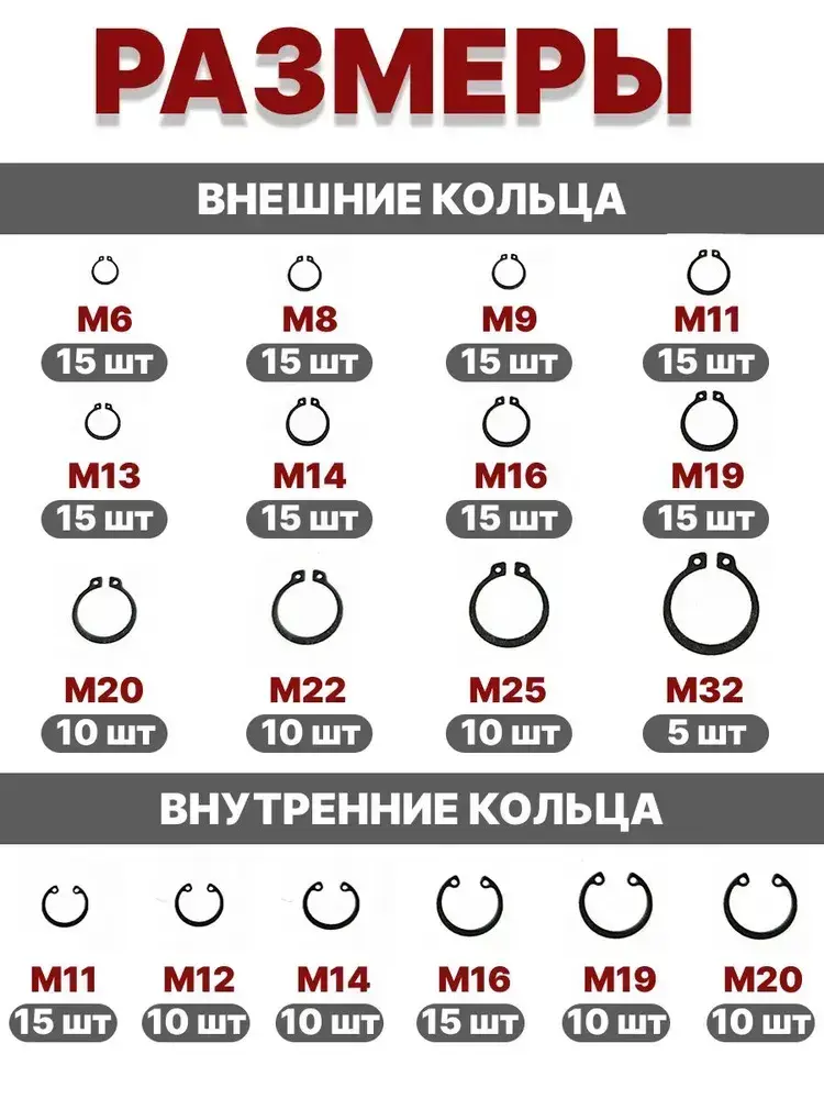 Стопорные кольца набор 6-32 мм 225 шт/ 18 видов / внутренние и внешние кольца