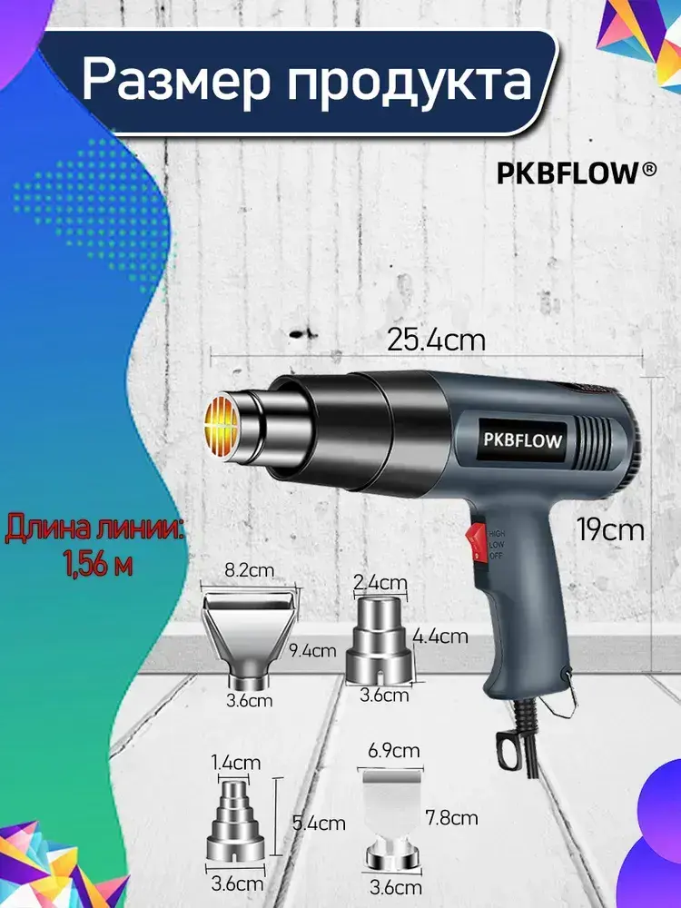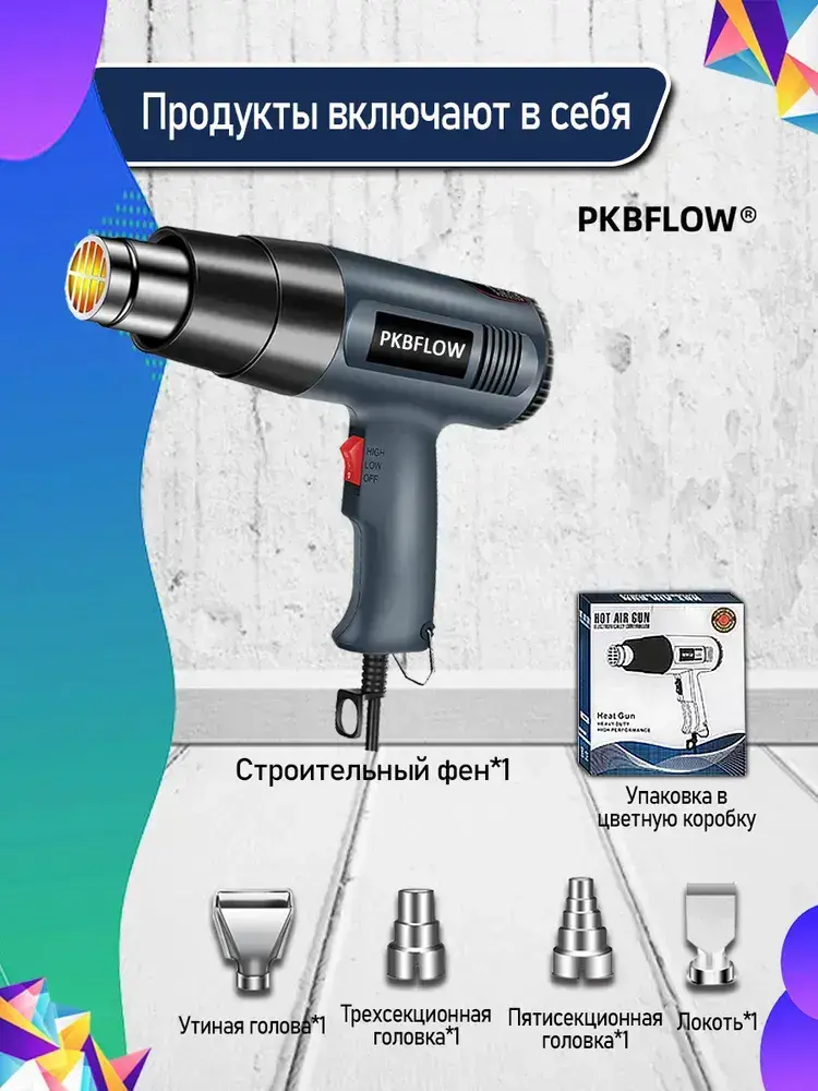 Строительный фен / Промышленный фен PKBFLOW / Бесступенчатый термостат /2000 Вт/Ручная регулировка, 4 насадки с дисплеем(2кВт, 300-500 л/мин, 60-600 градусов), профиссиональная серия