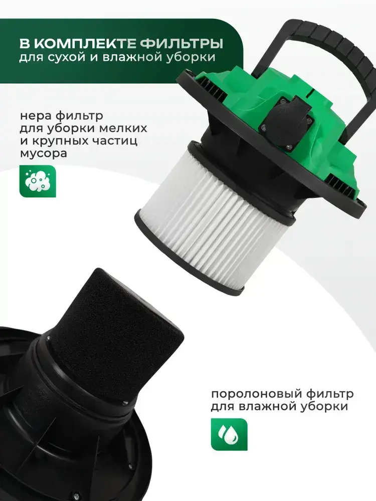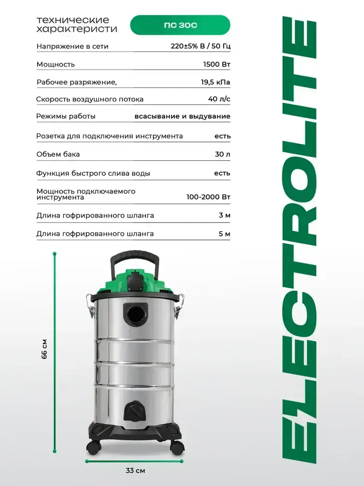Строительный пылесос, промышленный, электрический Electrolite ПС-30С( 1500 Вт, 30 литров, Шланг 3 М, НЕРА фильтр, сухая/влажная уборка, розетка для инструмента )