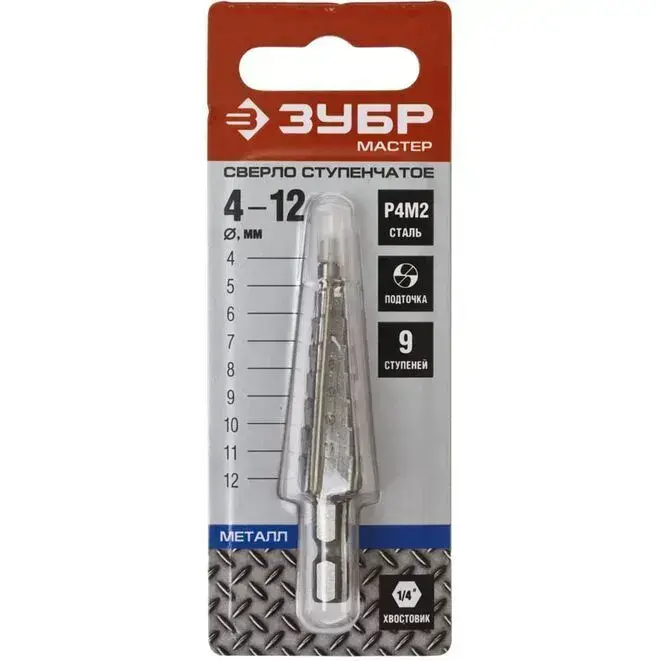 Ступенчатое сверло по металлу ЗУБР сталь P4M2, 4-12 мм, 9 ступеней 29665-4-12-9