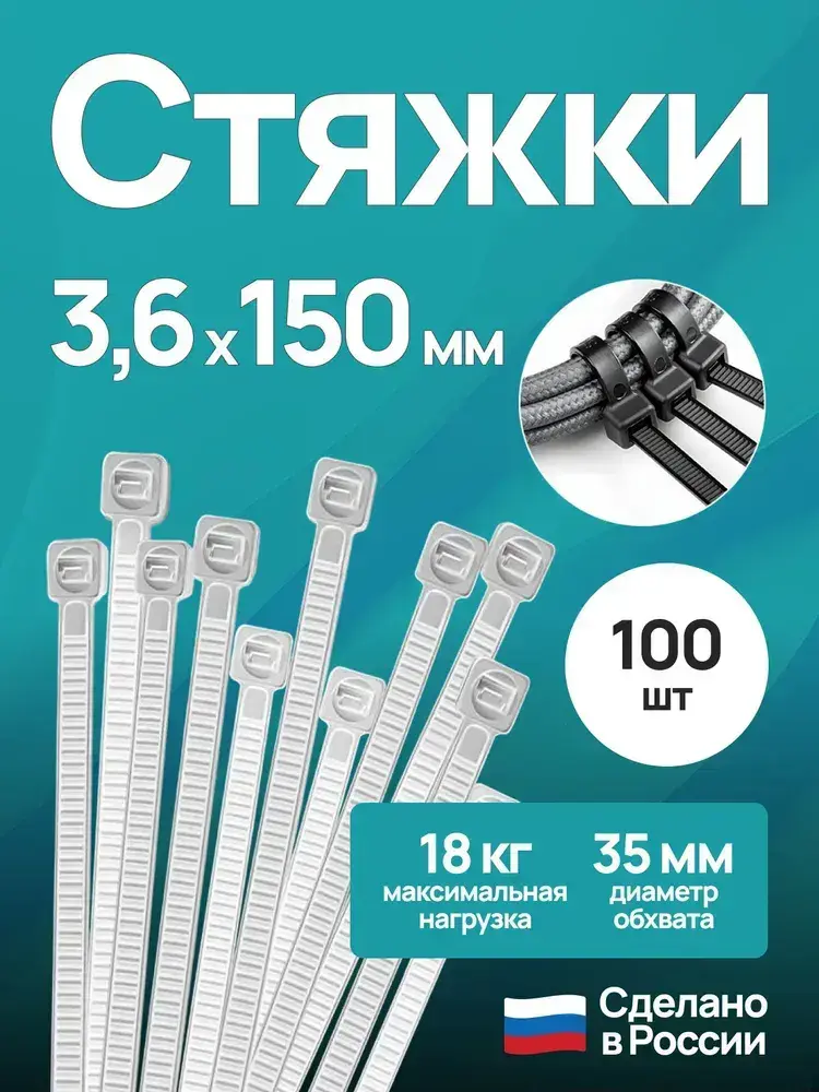 Стяжки пластиковые 3,6*150 мм, хомуты нейлоновые белые, 100 штук, кабельные, стяжка для проводов, хомут для монтажа проводки, нагрузка до 18 кг.