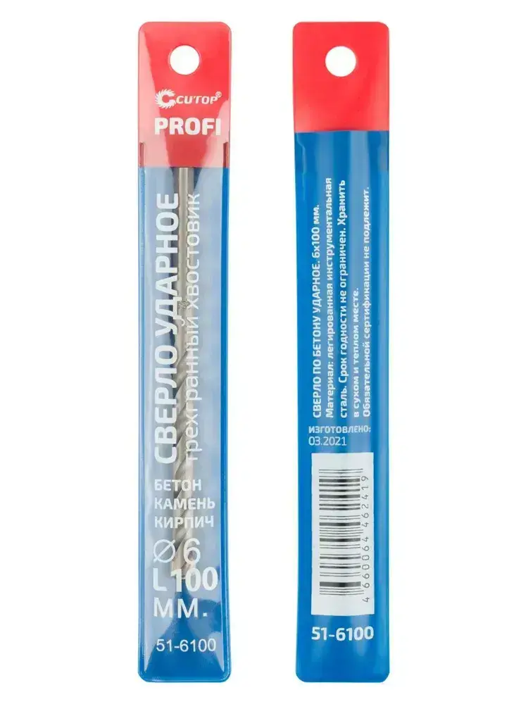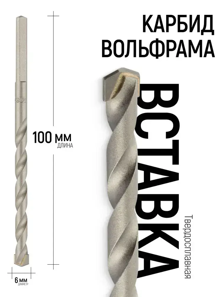 Сверло по бетону ударное 6 х 100 мм, трехгранный хвостовик