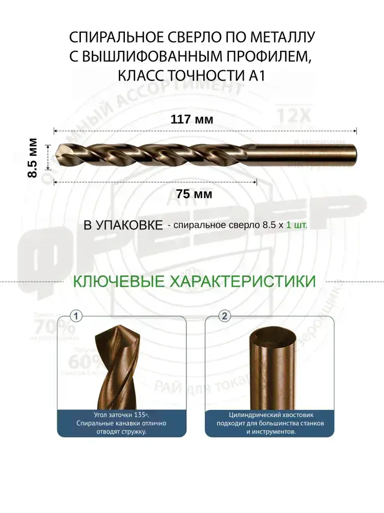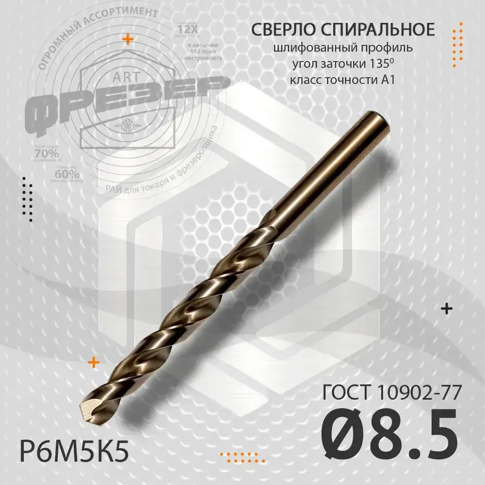 Сверло по металлу 8.5 мм цх Р6М5К5 А1 под резьбу М10 шаг 1.5 ГОСТ 10902
