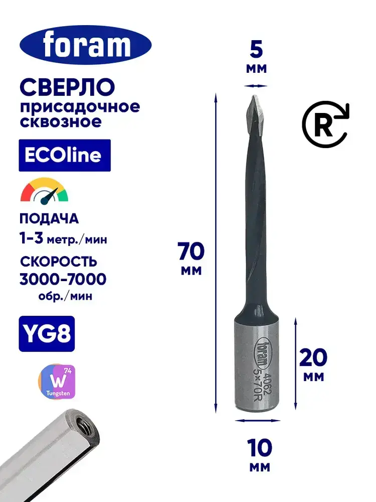Сверло сквозное присадочное FORAM D5x45x70-RH Правое вращение
