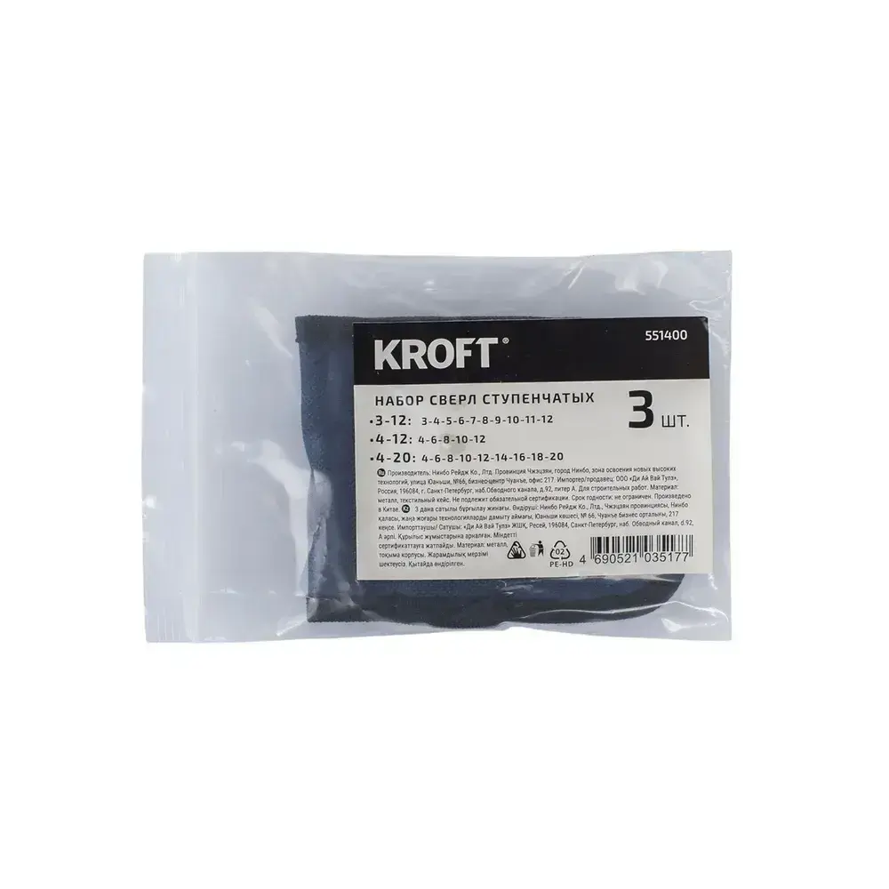 Сверло ступенчатое по металлу 3 шт 3-12 4-12 4-20 в чехле KROFT