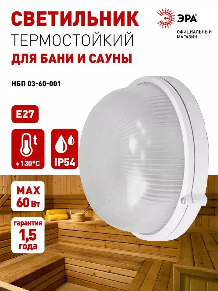 Светильник для бани и сауны ванной душа ЭРА НБП 03-60-001 Акватермо Е27 60Вт IP54 уличный термостойкий герметичный круглый