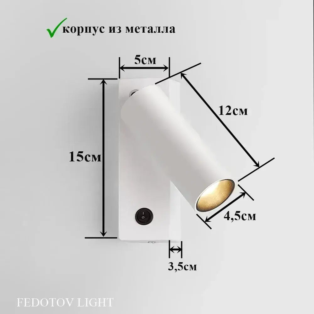 Светильник настенный светодиодный поворотный с выключателем, бра, 3000К, 7 Вт, белый