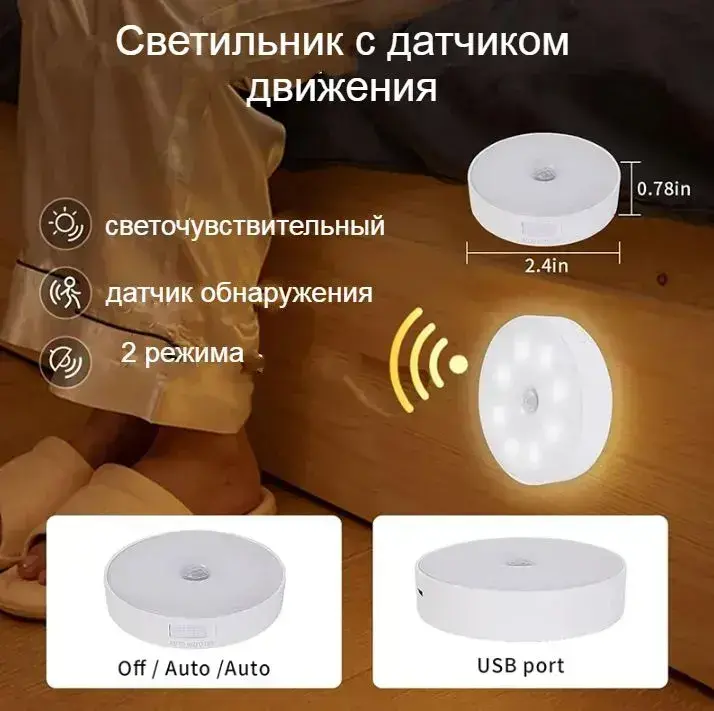 Светильник-ночник AOVV с датчиком движения ,круглый дизайн, на магнитном креплении, USB заряд, режим Холодный