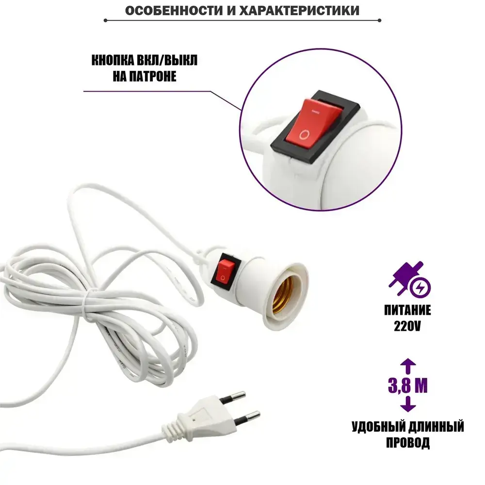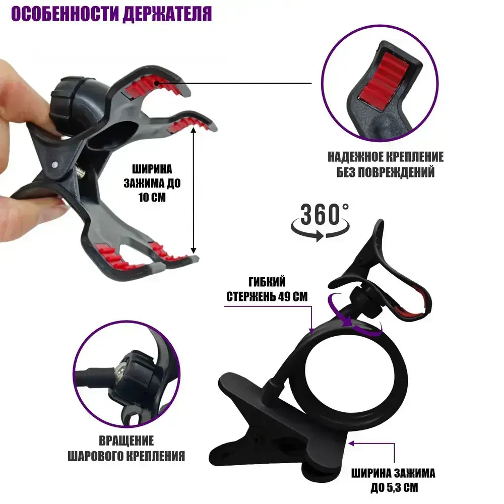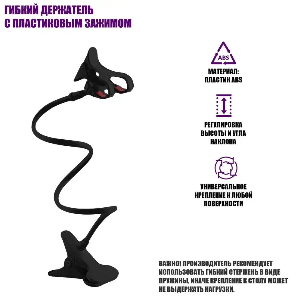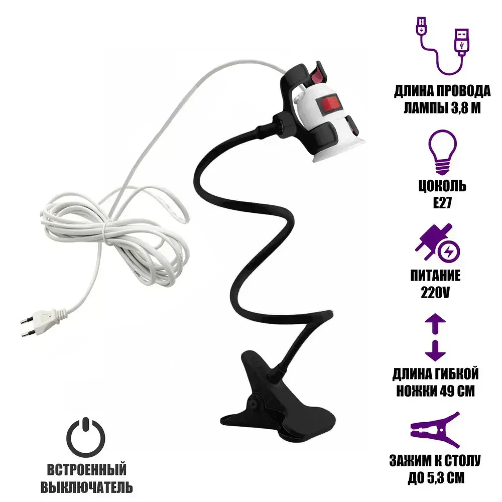 Светильник патрон с выключателем и кабелем на гибком черном держателе с пластиковым зажимом для стола