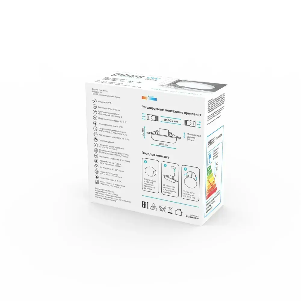 Светильник потолочный встраиваемый круг 9W 4000K 85mm Adjustable Frameless Gauss Elementary
