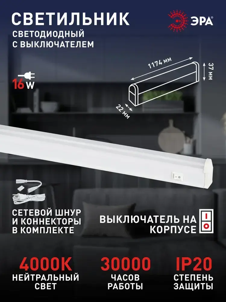 Светильник светодиодный линейный ЭРА LLED-01 на кухню с выключателем 1174мм 16Вт 4000K