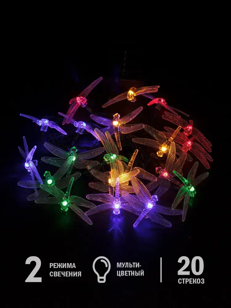 Светодиодная гирлянда садовая "Стрекозы" на солнечной батарее, ARTSTYLE, CL-SS28M, 20 светодиодов, 3,8м, мультицвет.