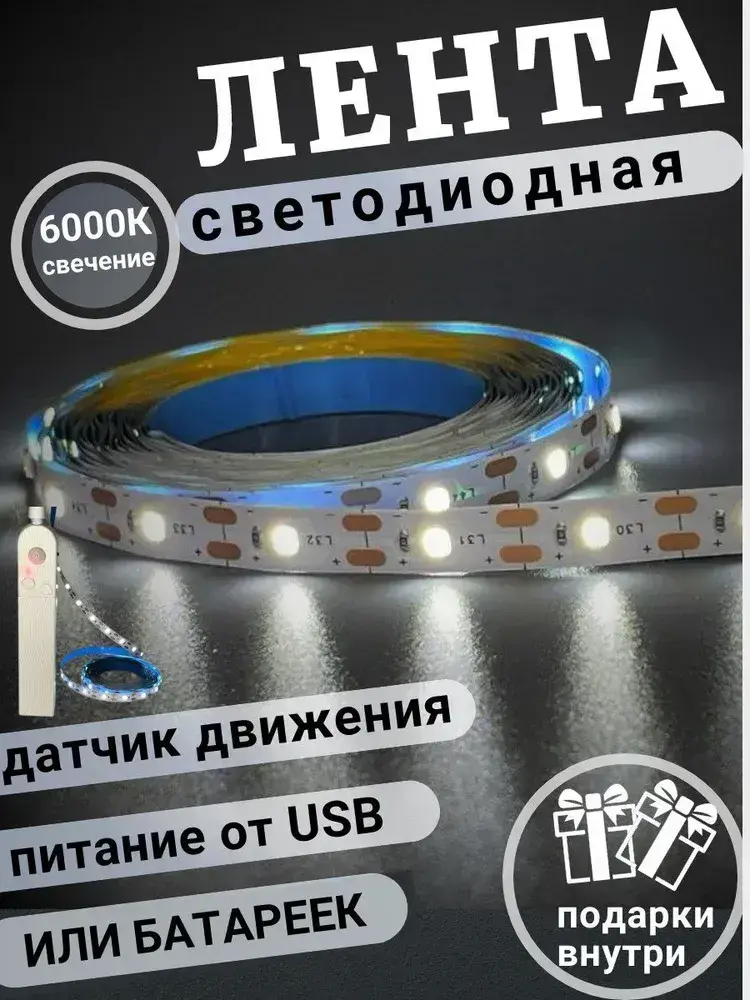 Светодиодная лента с датчиком движения на батарейках 3 метра холодный белый свет