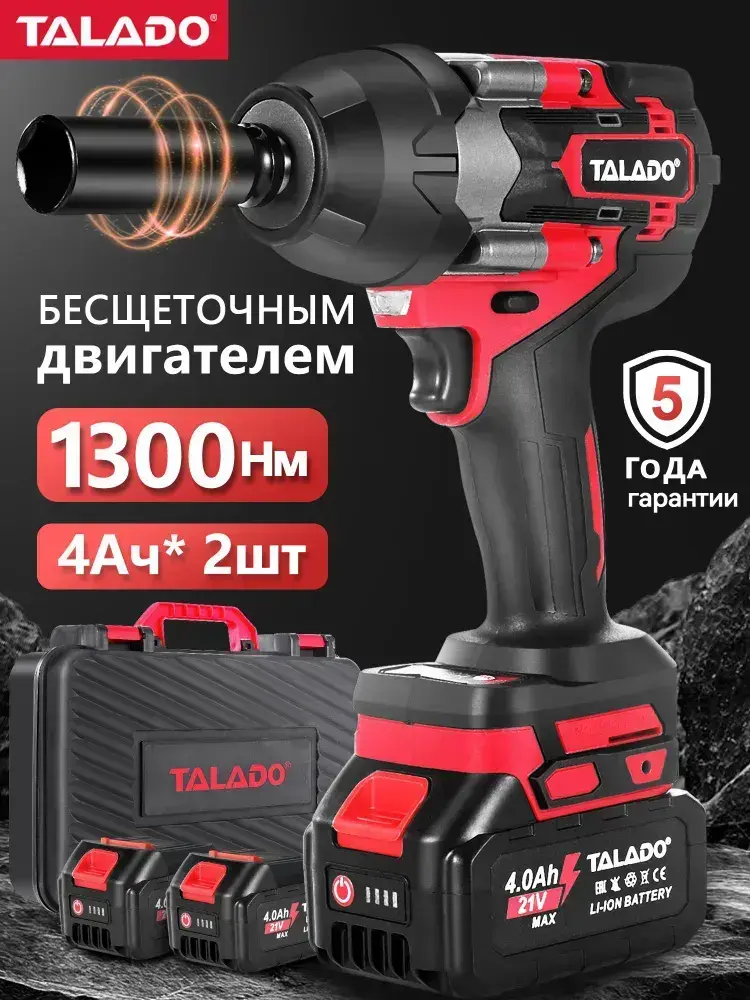 TALADO Гайковерт аккумуляторный ударный мощный 1300 Нм 21 В с 2 Li-ion аккумулятор 4Ач